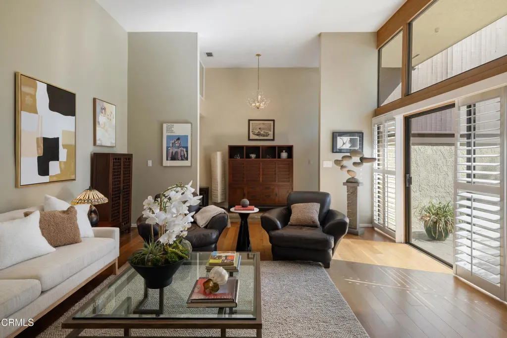 Welcome to one of Pasadena’s most desirable neighborhoods–the magnificent Orange Grove Boulevard or ‘Millionaire’s Row.’ This sophisticated, architectural townhome is nestled in a boutique, 13-unit complex and exemplifies pride of ownership. The two bedroom, three bath end unit, plus a den, marries the best of all worlds in its blend of comfort, style and location, all with an eye towards a stunning aesthetic. This light-filled end unit is wrapped in windows and offers tree-top views from every space.Step inside to find an expansive living room with soaring two-story ceilings, a stately, central fireplace and an adjoining, spacious patio that is ideal for entertaining friends, dining under the stars or simply relaxing with your morning coffee. The formal dining room opens to the remodeled kitchen with high-end appliances, a peninsula with seating and ample cabinet space. A cozy den has tall glass doors that lead out to a wide side patio that overlooks the verdant Defender’s Park below. The space makes for a perfect reading nook, TV lounge, or home office.The sumptuous primary suite includes its own fireplace, a luxurious updated bath, a custom walk-in closet, and access to a second balcony with views that frame the natural surrounding beauty while offering zen-like privacy. The additional light-filled bedroom offers an en-suite bath which is perfect for visiting guests.Highlights include an attached two-car garage with extra storage and a laundry area. The beautifully maintained grounds feature a pool and spa with HOA dues covering earthquake insurance, gardening and trash service. All this located just blocks from the Norton Simon Museum, Tartine, the numerous shops, cafes, and restaurants of Old Town Pasadena, as well as a front-row seat to the celebrated Rose Parade. Don’t miss this crown jewel of the boulevard!