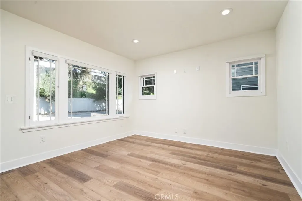 Beautifully remodeled three-bedroom, two-bathroom, 1,540 SF home situated on a spacious lot with a gated driveway and an additional detached room in the backyard—ideal for an office, playroom, gym, or extra storage. Conveniently located near downtown Pasadena, Pasadena City College, and major freeways. A charming front porch welcomes you into the light-filled living room with large front-facing windows and an open layout. The updated kitchen features new cabinetry, quartz countertops with designer backsplash, and stainless steel appliances including a gas range, dishwasher, and refrigerator. A dedicated laundry room offers direct access to the side driveway. The oversized primary suite includes a walk-in closet with custom built-ins and French doors opening to the backyard. The primary bathroom boasts a dual-sink vanity with quartz counters, a soaking tub, and a spacious walk-in shower. Two additional bedrooms offer generous closet space and share a full hallway bathroom with a shower/tub combination. Additional built-in hallway storage adds convenience. Upgrades include: new interior and exterior paint, vinyl wood flooring thru-out, raised panel interior doors, recessed lighting, tankless water heater, upgraded baseboards, interior window blinds, ceiling fans, and a newer front door. Enjoy a private, gated driveway with extra rear parking and a low-maintenance backyard and front yard finished with artificial turf, perfect for relaxing or entertaining.