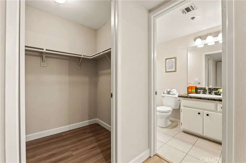 Both bedrooms feature wood flooring and operable blinds. The primary suite includes a walk-in closet and an en-suite bathroom with a granite vanity and a shower-over-tub with a framed glass enclosure. The second bedroom can be used as a home office.