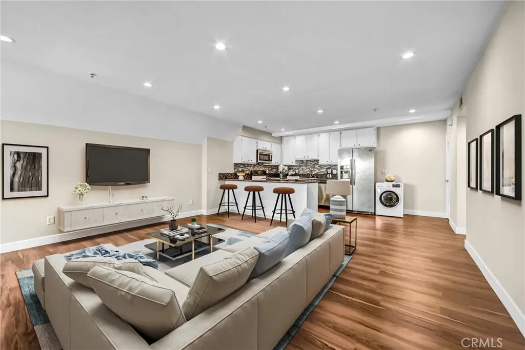 The kitchen features granite countertops, white cabinetry, mosaic tile backsplash, stainless steel appliances, a large island, and an in-unit washer and dryer.