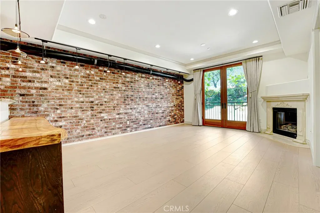 Inside, the home offers a bright and airy living space enhanced by 9-foot ceilings, crown molding, recessed lighting, and a custom 8-foot French door that invites in natural light. A brick accent façade and a beautifully crafted stone fireplace add warmth and architectural character, creating an inviting setting for both everyday living and relaxed entertaining.