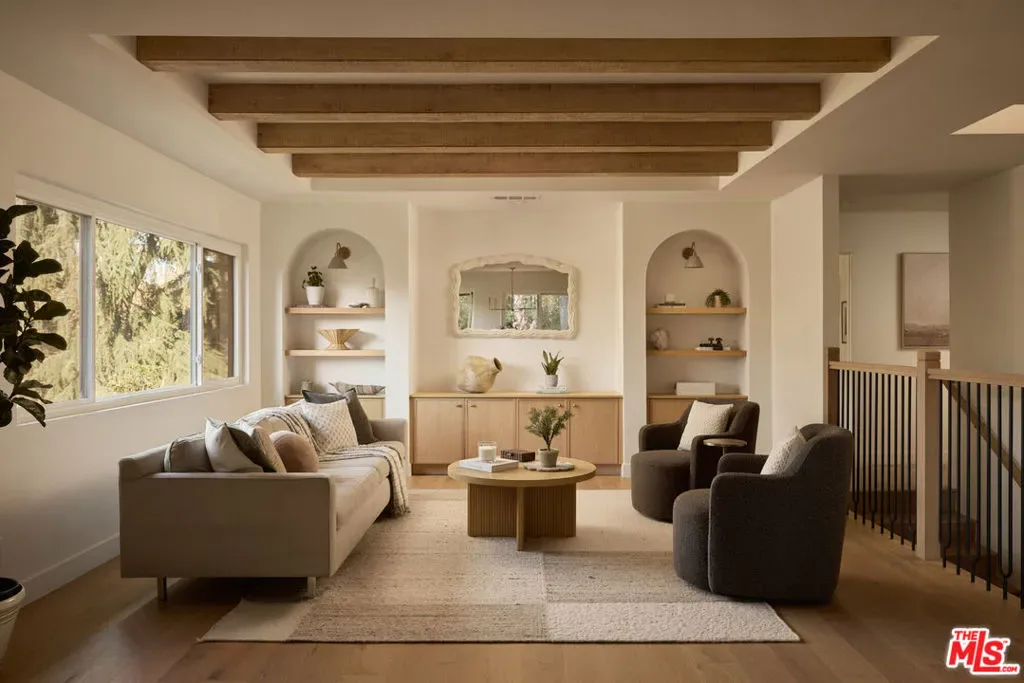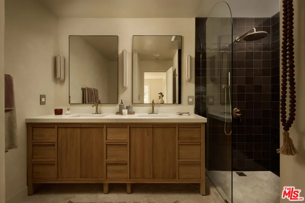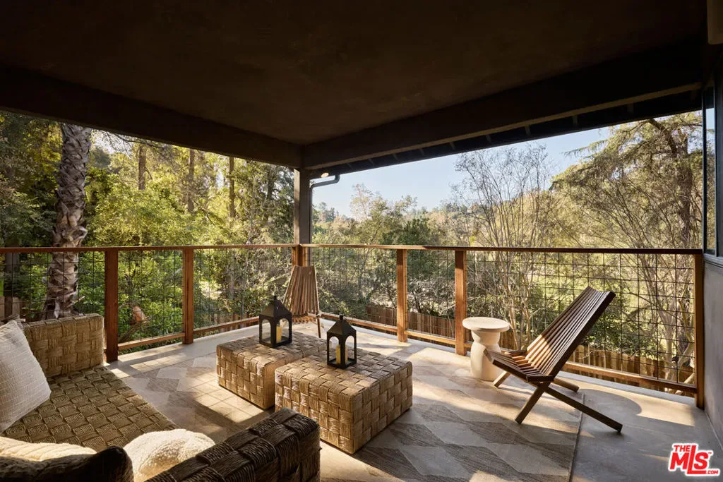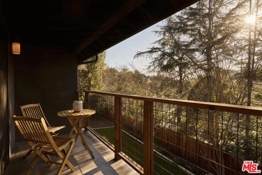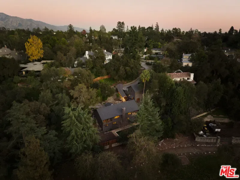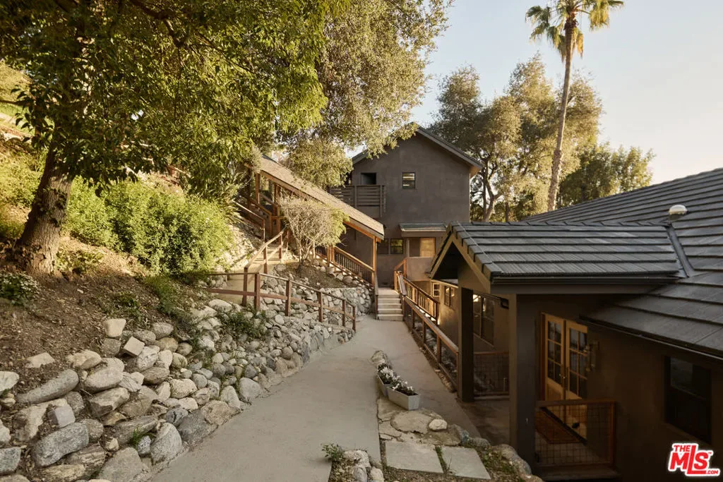 A fully reimagined, multi-level hillside home by Nicole Douglas Designs, defined by craftsmanship, privacy, and its connection to nature. A processional, pavilion-style entry leads through a covered timber passage framed by hand-crafted joinery, descending steps, and filtered light, all signaling a transition into a tranquil retreat. Inside the main house, curved arched doorways and continuous Mullican European White Oak flooring establish a seamless flow between spaces. The kitchen serves as a central gathering point, where materiality and function are thoughtfully designed. A Taj Mahal quartzite island is the focal point, complemented by Wolf and Sub-Zero appliances, custom White Oak Slim Shaker cabinetry, hand-made white oak spice shelves within a carved arched stove hood, integrated vertical wine storage designed for temperature stability, and large windows that bring in abundant natural light. A walk-in pantry is discreetly positioned off the kitchen, providing generous storage and prep capacity. The kitchen opens into the dining area and main living room, where a flame-lit natural gas fireplace finished in Venetian plaster is paired with a solid wood mantel. The primary bedroom is set apart with its own private deck overlooking the grounds. The en-suite bathroom is finished in stone and spa-like tile featuring dual vanities and a glass-enclosed walk-in shower. The lower level includes 3 additional bedrooms, an office, and a flexible space suitable for a media or family room. A lower-level deck extends the living area outward, creating an ideal setting for a wellness or workout space surrounded by nature. A separate guesthouse includes its own kitchenette, living and dining areas, private balcony, and ensuite bedroom, offering flexibility for guests, creative use, or income opportunities. The backyard is designed as a true extension of the home with terraced pathways, multiple seating areas, mature trees, and a grassy lawn area optimal for entertaining. A rare amenity further distinguishes the property: direct private access to Brookside Park, offering additional walking paths, tennis courts, and recreational areas just beyond the property line. Located in one of Pasadena’s most desirable residential pockets, 521 Fremont Drive is moments from the Rose Bowl, Old Town Pasadena, and the best of the city’s culture and dining.