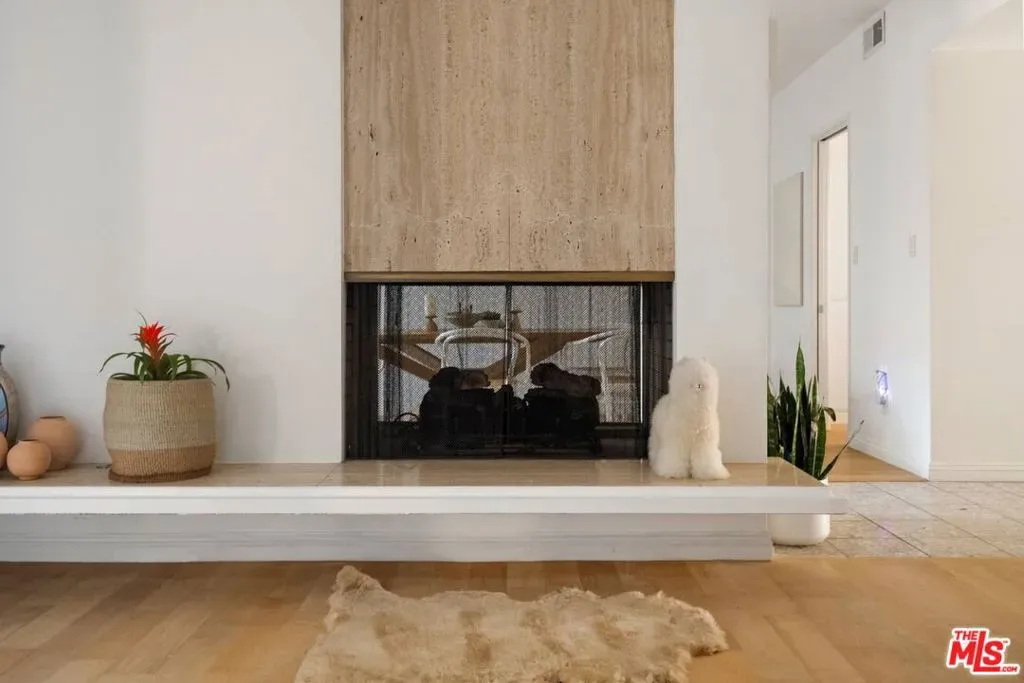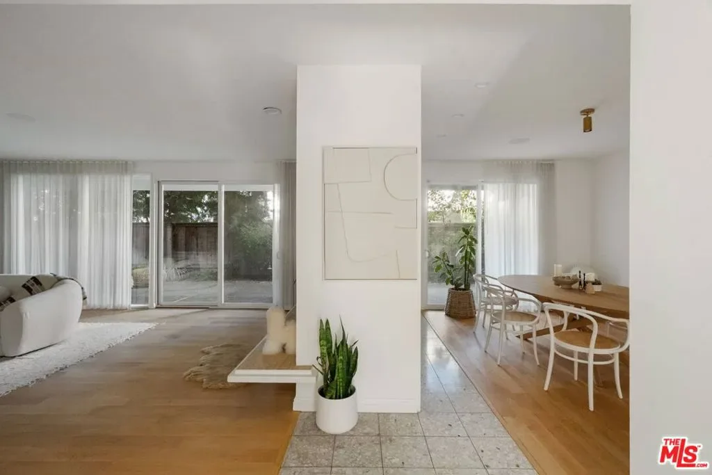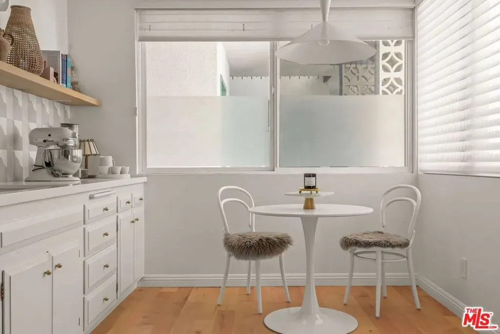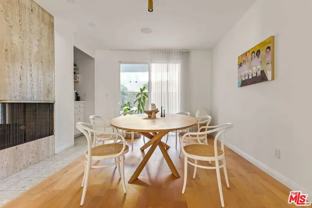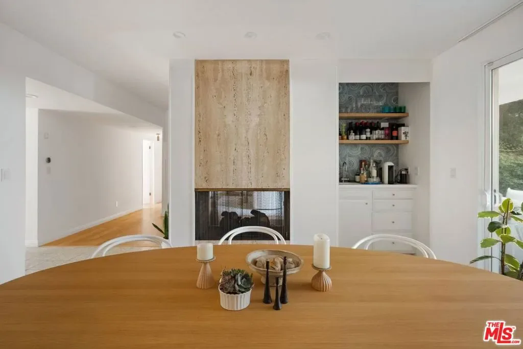 A study in restrained mid-century elegance, this thoughtfully reimagined single-level residence pairs clean architectural lines with a warm, modern sensibility. One of just eight residences in a well-kept Pasadena enclave, the home unfolds with a sense of calm, proportion, and light.Recent renovations honor the home’s original design language while introducing a refined material palette. Maple flooring runs seamlessly throughout, grounding the interiors with subtle warmth. The kitchen has been reworked as both functional workspace and visual focal point, featuring updated countertops, open shelving, integrated lighting, and upgraded appliances. Nearby, a reimagined dining area reveals a custom built-in bar, an understated nod to mid-century entertaining culture. Living spaces are anchored by a double-sided fireplace and framed by floor-to-ceiling glass sliders that extend the interior outward. The expansive private patio has been newly landscaped, offering a quiet continuum of indoor-outdoor living ideal for both everyday living and gatherings. Bathrooms have been thoughtfully updated, balancing modern refinement with preserved mid-century elements that speak to the home’s architectural lineage. Additional amenities include in-unit laundry, generous storage, a powder room for guests, and two covered parking spaces. Set moments from everyday conveniences and Pasadena landmarks, the home offers a rare blend of design integrity, livability, and location. An effortless expression of mid-century living, reinterpreted for today.