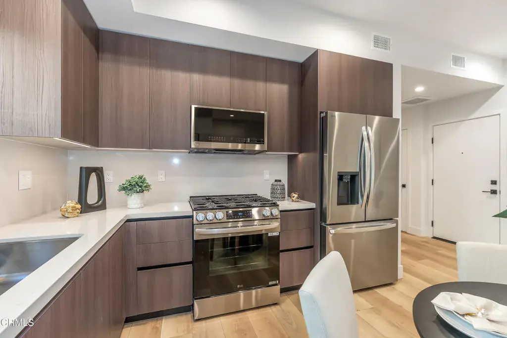 One of 19 stunning new condos in Pasadena’s Vibrant Playhouse Village…Welcome to your modern retreat in the heart of Pasadena. This brand-new, luxury condominium blends sophisticated design, quality finishes, and unbeatable location for an elevated urban lifestyle.Step inside to discover an open-concept living area filled with natural light, designer recessed lighting, and wide-plank wood floors that flow seamlessly throughout. The gourmet kitchen features sleek wood-grain cabinetry, premium stainless-steel appliances, quartz countertops, and a full-height backsplash–perfect for cooking and entertaining in style. The bedroom treats one to a calm, beautiful space complete with oversized windows, custom lighting, and a spacious closet. The spa-inspired bathroom impresses with gorgeous dual vanities that flaunt modern fixtures, quartz counters and elegant large-format porcelain tile. You’ll appreciate the private patio–ideal for morning coffee or evening relaxation, but don’t miss the spectacular 5th floor rooftop deck featuring multiple lounge areas, lush planters, and a built-in BBQ and fire pit for ultimate ambiance to match the panoramic city and mountain views.Developed by a local builder with a strong track record of creating exceptional condominiums throughout Pasadena, Midtown Condos reflects a deep commitment to quality and community.NOTE: renderings and video depict a similar unit but are NOT photos of the exact unit.