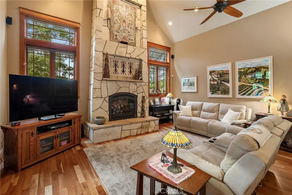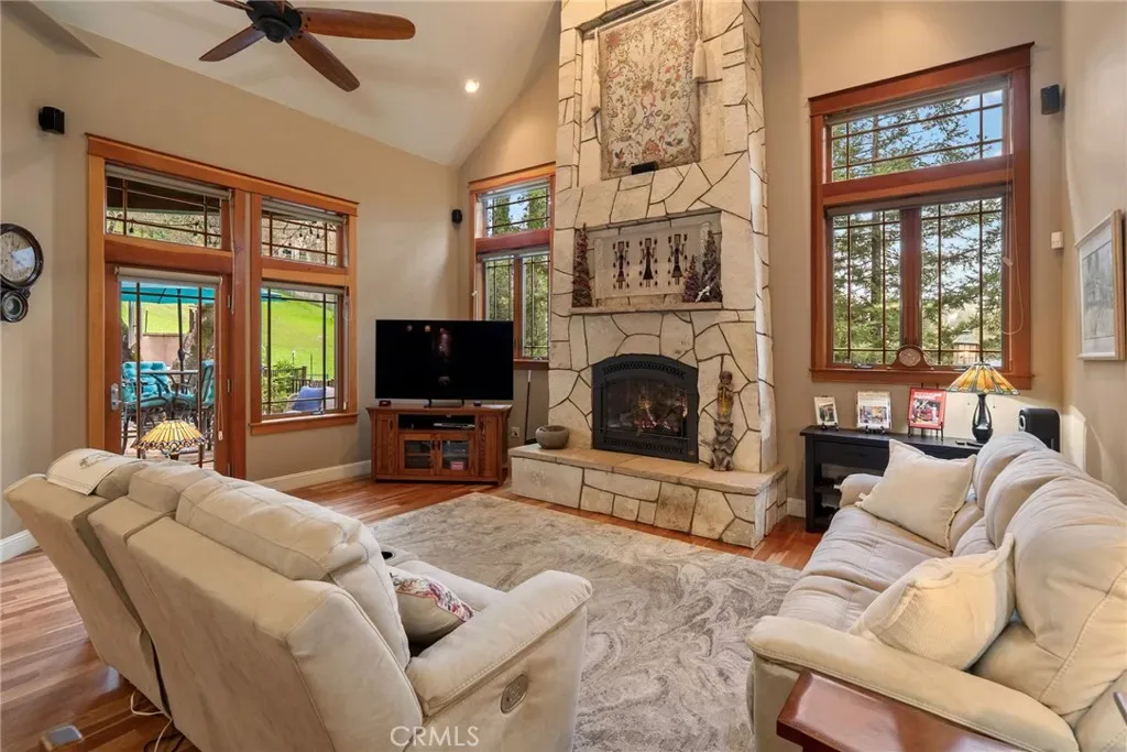 Inside the 2,600± sq ft main home, hardwood floors flow through the kitchen, living room, family room, and hallways, while Milgard dual-pane windows with craftsman trim bring abundant natural light. Energy-conscious upgrades include owned solar, fire sprinkler system, tankless Rinnai water heater, and fire and home security systems.