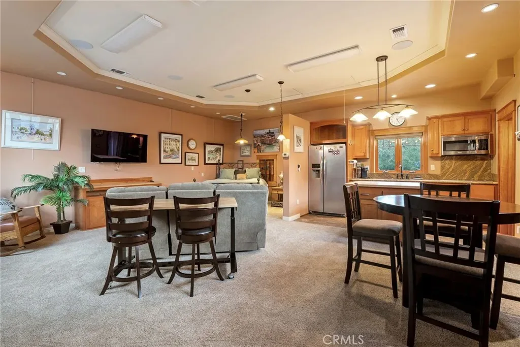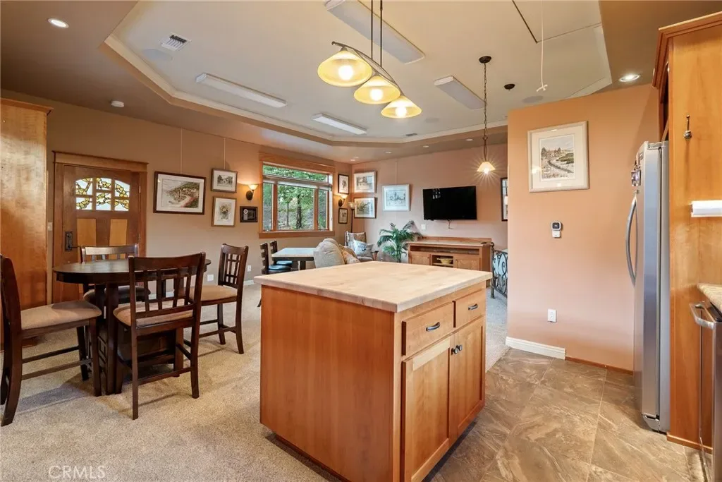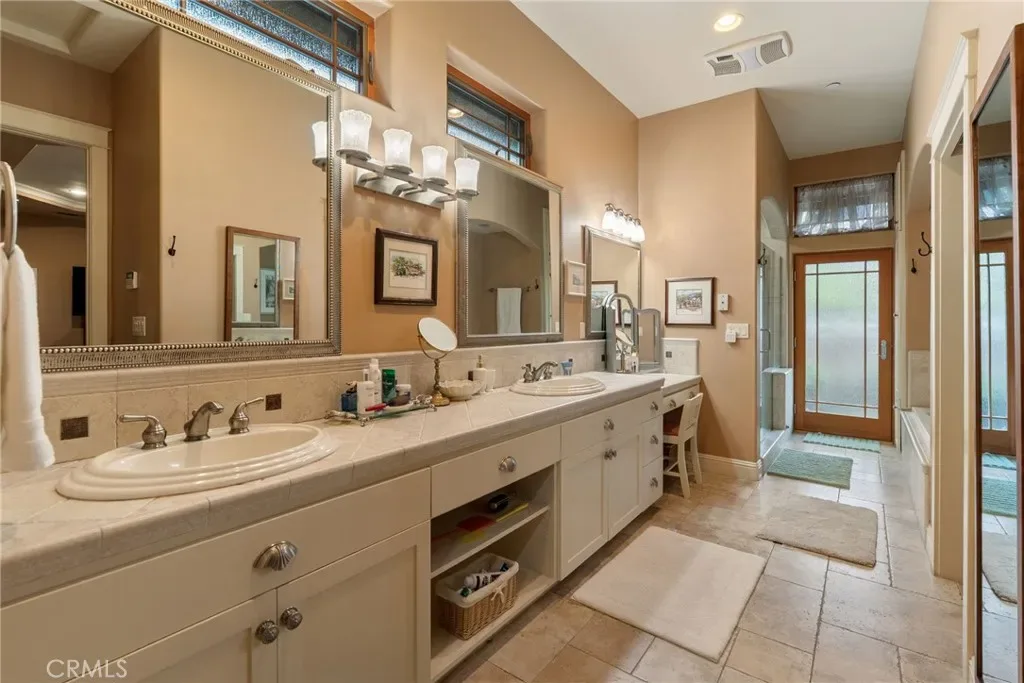 The chef’s kitchen showcases custom Morro Bay Cabinets, granite countertops and backsplash, a butcher block island workstation, and an impressive 23″ x 104″ breakfast bar. Premium appliances include two dishwashers, two ovens, refrigerator, built-in microwave, wine cooler, and trash compactor, making the space ideal for entertaining and everyday living.