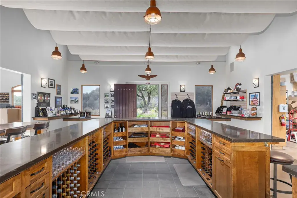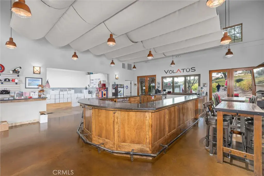 A turnkey 1,500± sq. ft. tasting room, built in 2000, offers an immediate opportunity to establish or expand your brand—or to enjoy a steady revenue stream. The contemporary structure features dramatic high ceilings, a sleek horseshoe-shaped bar, and a foldable pass-through window opening to a vineyard-view patio. Adding to the relaxing atmosphere of the patio, are views of vines, ancient oaks, and garden space, all complimented by spectacular sunset views. One wing houses a temperature-controlled cold storage area, while the opposite wing can serve as a small production area, members’ lounge, or space for showcasing a secondary label. The owner previously operated a boutique tasting room and ran production from the second wing, with barn doors that open to crush pad space. Glass garage-style doors separate the wings from the tasting bar. The tasting room is currently leased, and tenants are open to continuing occupancy.