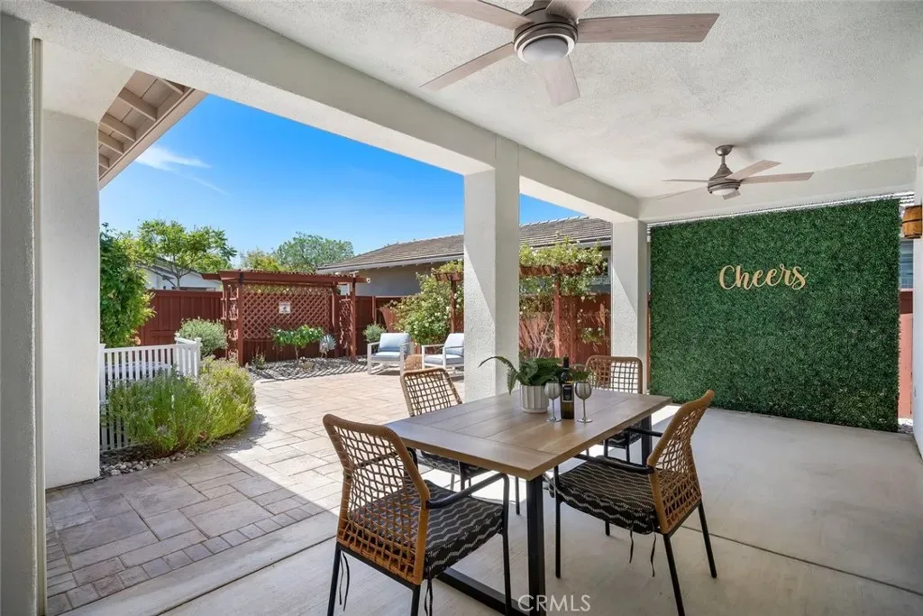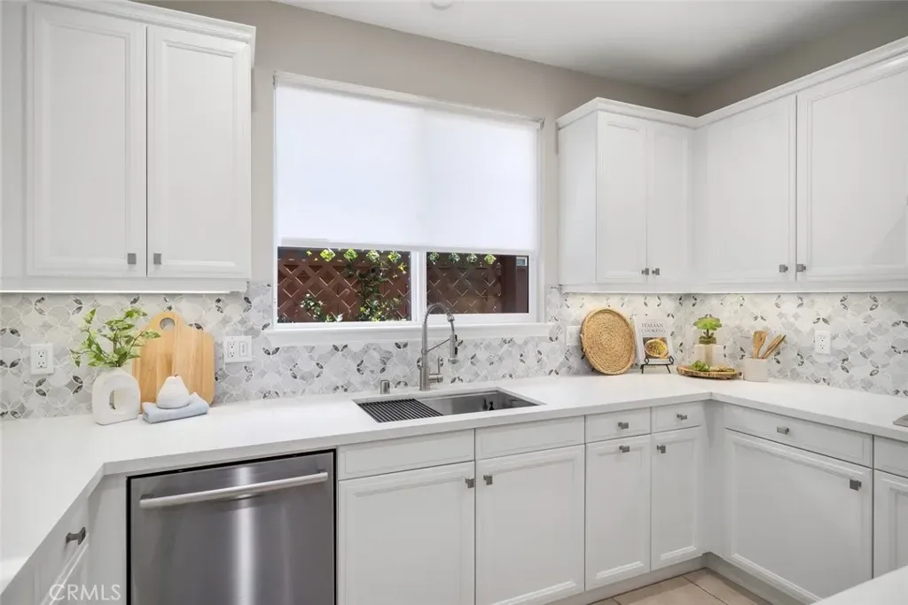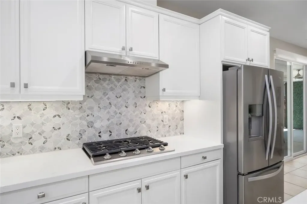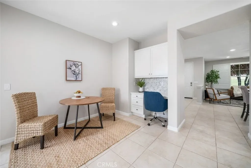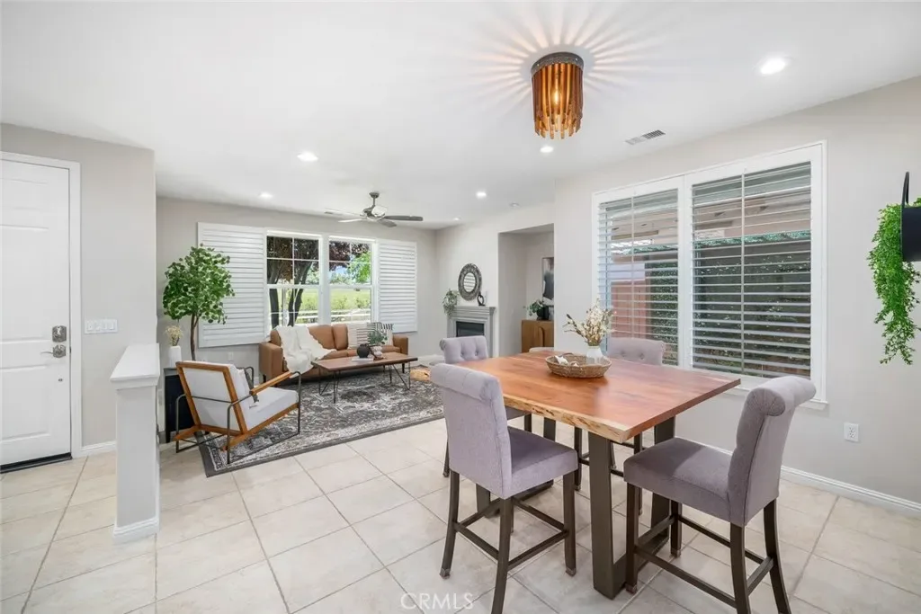 Step inside to discover a light-filled, open-concept living space designed for both comfort and style. The inviting living room features a cozy gas fireplace and elegant plantation shutters, creating a warm yet sophisticated ambiance. The thoughtfully updated kitchen is a true highlight, showcasing upgraded quartz countertops, stainless steel appliances, a stunning designer backsplash, a cozy breakfast nook, and a convenient built-in desk area. A sliding glass door seamlessly connects the kitchen to the private backyard patio—ideal for indoor-outdoor living.