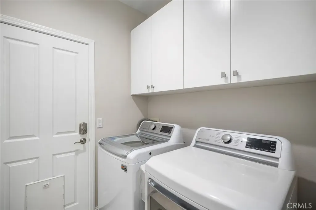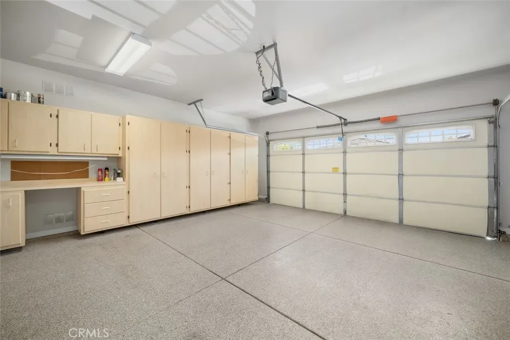 Additional features include an attached garage outfitted with built-in cabinetry, a dedicated workspace, epoxy flooring, a mini-split heating/air conditioning system, and a Tesla charger. The indoor laundry room adds convenience with cabinets offering plenty of storage space and includes a barely used washer and dryer set.