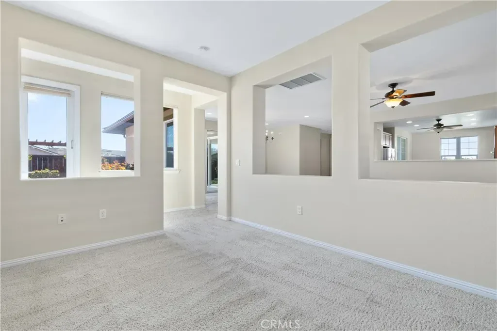 Situated as a desirable end unit, the home enjoys convenient guest parking along Traditions Loop. The front entrance opens directly onto a beautifully manicured greenbelt maintained by the HOA, creating a peaceful and inviting first impression. The finished two-car garage is accessed from Benicia Lane and includes an attached 200+/- square foot hobby room, complete with its own mini-split heating and cooling system, perfect for projects, crafts, or additional workspace.