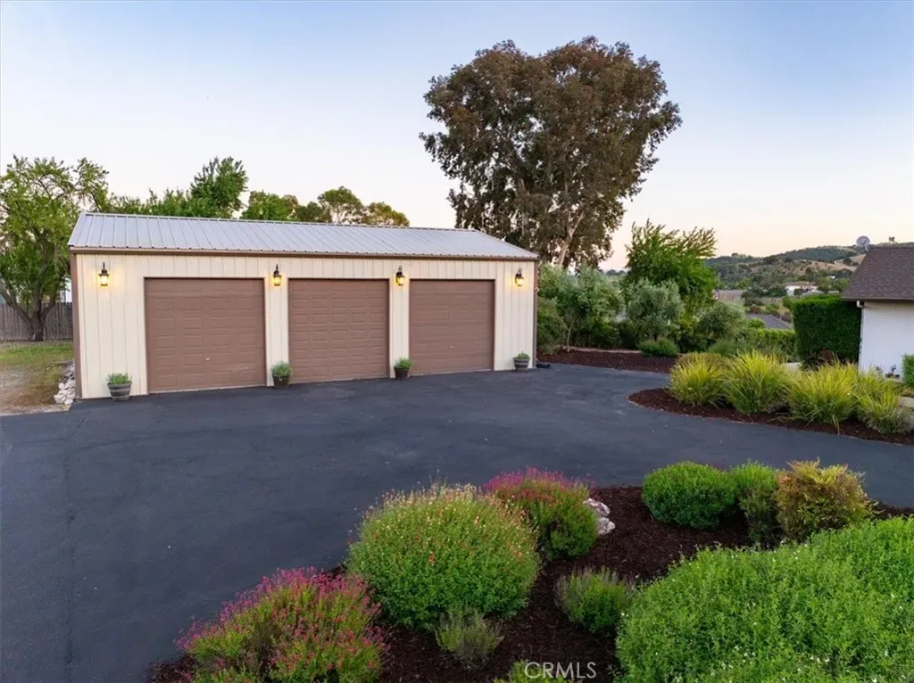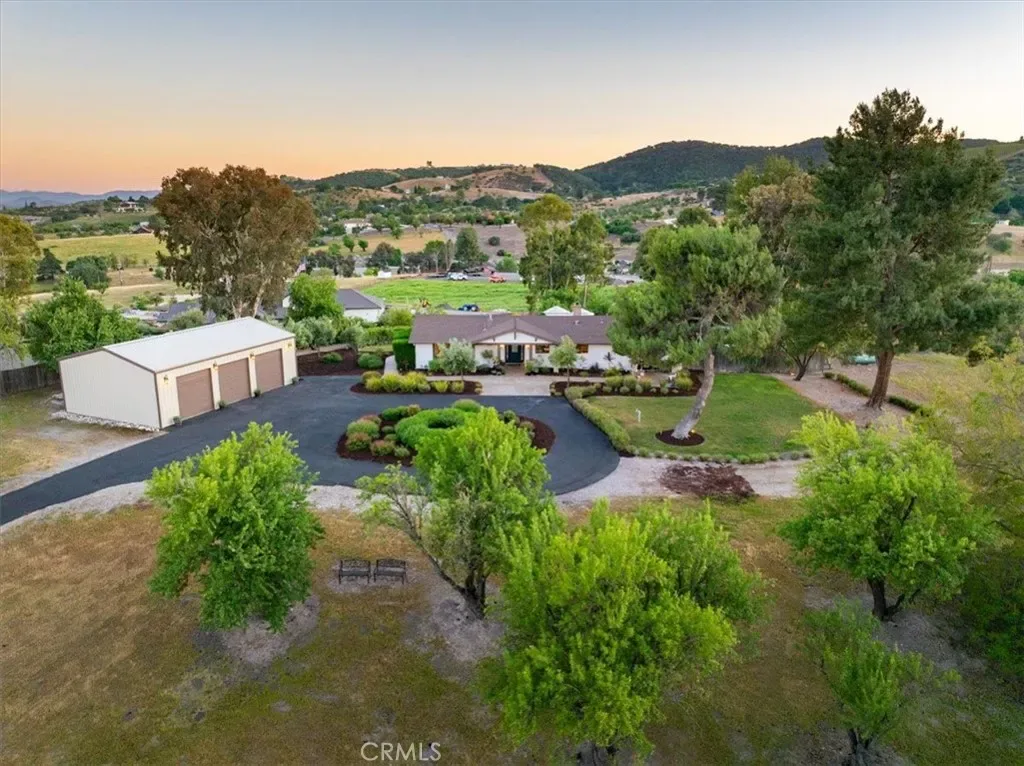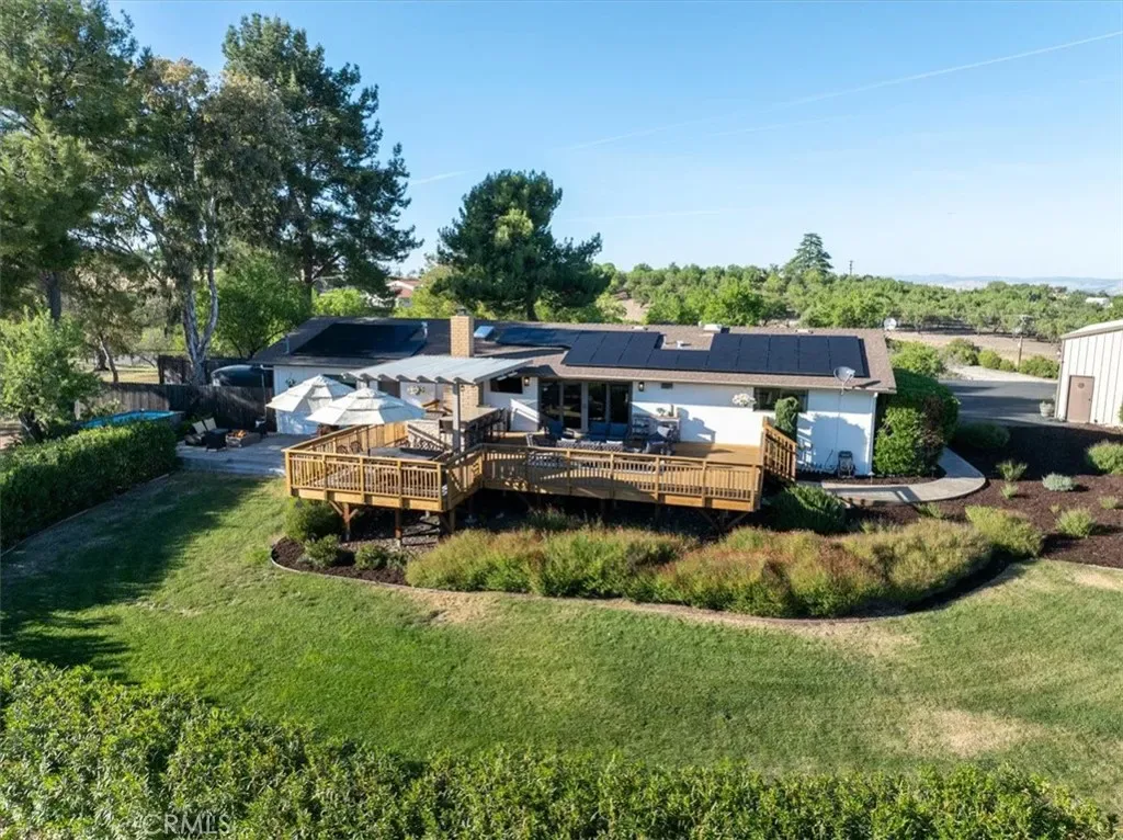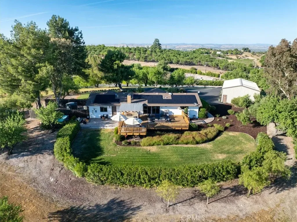 Resting on nearly four rolling acres and set in the middle of gorgeous almond trees, this fantastically remodeled luxury residence is a rare offering that blends refined living with the beauty of the natural landscape — all just a couple of minutes from town. Situated in one of Paso Robles’ most coveted westside cul-de-sac locations, you will enjoy the sweeping circular driveway that sets the tone with lush landscaping and a welcoming entry that hints at the quality within. Inside, warm bamboo floors and a stunning real-stone surround gas fireplace anchor the main living space, while a climate-controlled wine closet and a versatile flex room — perfect as a private library or music retreat — speak to thoughtful, sophisticated design. The home flows effortlessly to the massive newer redwood deck engineered for effortless entertaining, complete with a built-in barbecue complete with seating, refrigerator, ambient lighting, and heaters — all framed by breathtaking panoramic views that stretch across the surrounding countryside. The layout of the home features two generous primary suites, a third bedroom, and a full bath. The main primary is luxurious and privately located on a separate wing of the home and has a private attached patio and spa-like bathroom. The chef-appointed kitchen shines with stainless KitchenAid appliances, warm updated warm cabinetry and rich granite countertops. Nearly every system and surface has been extensively updated. A fully owned solar system with 30 panels, installed in 2021, conveys with the property. Outside, the beautifully curated grounds offer stamped concrete hardscape, multiple patios, a fire pit, a handmade plunge pool, and automated landscape irrigation — all designed for low-maintenance enjoyment of this spectacular setting. Completing the package is an approximately 1,350 sq ft shop with three oversized roll-up doors — ideal for the hobbyist, car enthusiast, contractor, or anyone needing flexible workspace. This is more than a home — it’s a lifestyle.