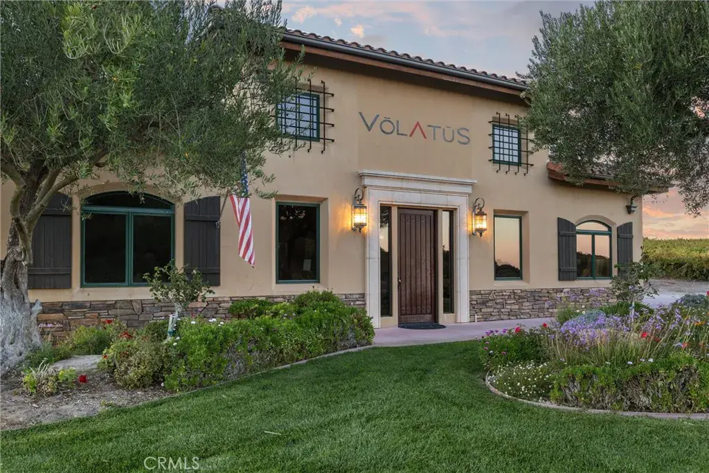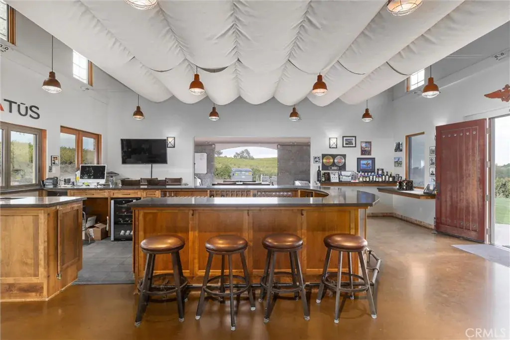 A turnkey 1,500± sq. ft. tasting room, built in 2000, offers an immediate opportunity to establish or expand your brand—or to enjoy a steady revenue stream. The contemporary structure features dramatic high ceilings, a sleek horseshoe-shaped bar, and a foldable pass-through window opening to a vineyard-view patio. Adding to the relaxing atmosphere of the patio, are views of vines, ancient oaks, and garden space, all complimented by spectacular sunset views. One wing houses a temperature-controlled cold storage area, while the opposite wing can serve as a small production area, members’ lounge, or space for showcasing a secondary label. The owner previously operated a boutique tasting room and ran production from the second wing, with barn doors that open to crush pad space. Glass garage-style doors separate the wings from the tasting bar. The tasting room is currently leased, and tenants are open to continuing occupancy.