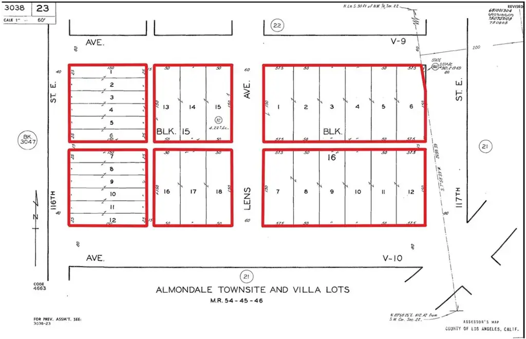 APN: 3038-021-037, 3038-021-040, 3038-021-041, 3038-022-046, and 3038-023-032 Coordinates: 34.503944, -117.922583 5 parcels being sold together in Pearblosson, CA. Total acreage of 54.91. These lots are zoned commercial and run along 116th St in Pearblossom.