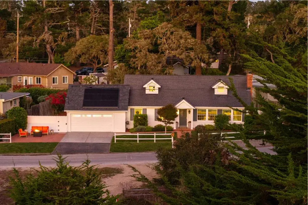 Ideally located across from the 8th hole of Monterey Peninsula Country Club, this timeless Cape Cod-style home offers coastal elegance and relaxed Pebble Beach living. The fully fenced, beautifully landscaped yard surrounds a 4-bed, 2.5-bath home designed for privacy, comfort, and indoor-outdoor living just moments from the beach. The main level features a spacious primary suite, guest bedroom, full bath, living room with fireplace, formal dining, and a light-filled kitchen. Upstairs offers two bedrooms, a flexible office/den, and half bath. Three outdoor sitting areas are perfect for morning coffee, evening cocktails, or entertaining. Tesla solar panels and Powerwall battery provide energy efficiency and backup power. Enjoy access to beaches, hiking trails, world-class golf, top restaurants, and Pacific Grove schools. A rare opportunity to own a classic coastal retreat in one of Pebble Beachs most coveted locations.