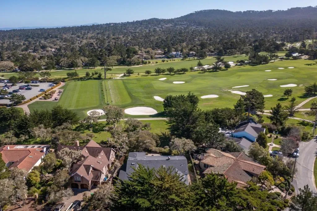 Ideally situated across from the lush green open space at the end of the MPCC driving range and surrounded by majestic oak trees, this single-level home embraces the natural beauty of Pebble Beach. The front entrance opens into an enclosed patio, offering both privacy and a warm, inviting outdoor living space. The remodeled kitchen and family room provide expansive views, creating a comfortable and casual environment for everyday living. The large, open dining and living areas feature high wood ceilings and offer easy access to both the private front courtyard with a hot tub and the backyard, making these spaces ideal for entertaining or relaxing. Three bedrooms and three bathrooms are thoughtfully arranged to ensure separation and privacy, and the home includes a security system. The spacious primary bedroom stands out with its wall of closets and extensive built-in bookshelves, offering both storage and a touch of elegance. A three-car garage is perfect for the car enthusiast. Walk to the beach, bike to Spanish Bay, or simply relax and enjoy the lovely setting.