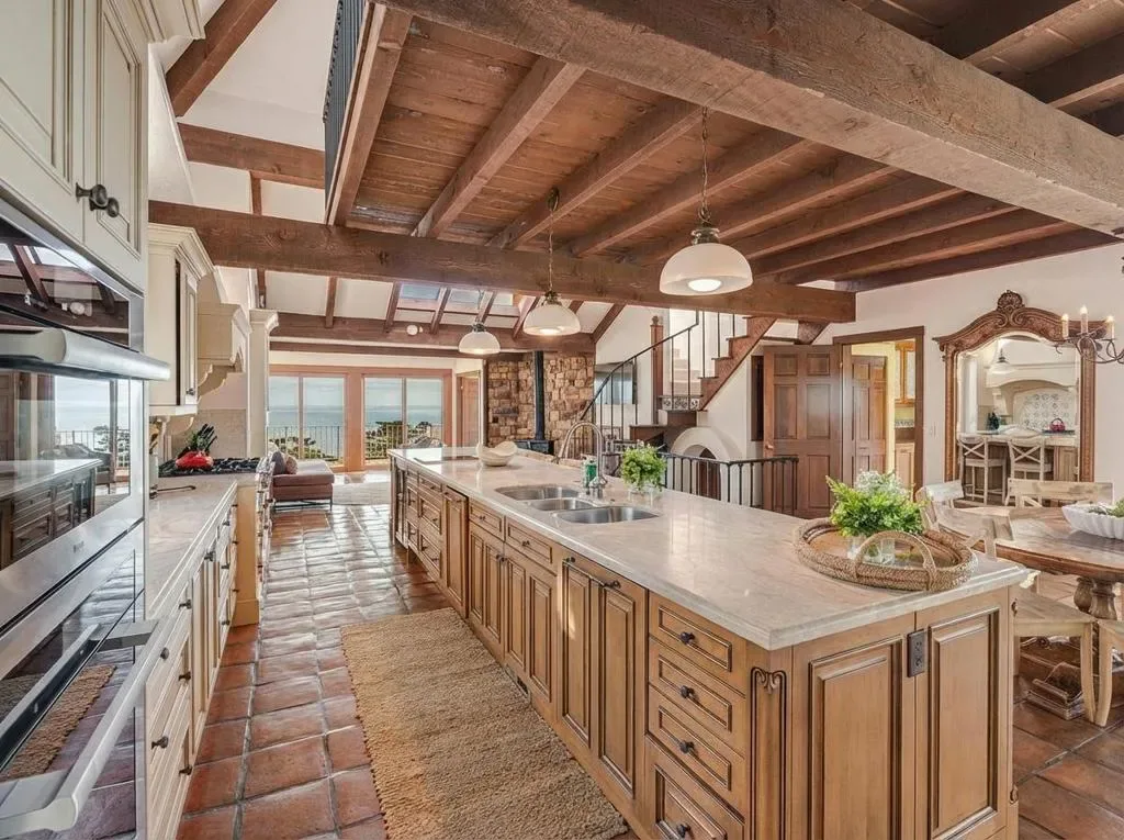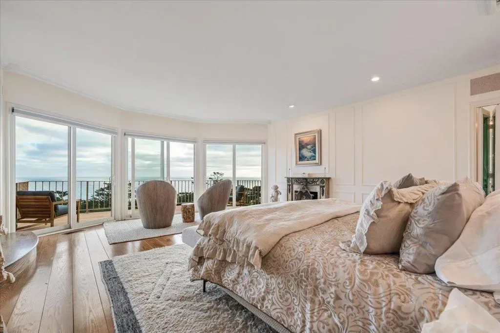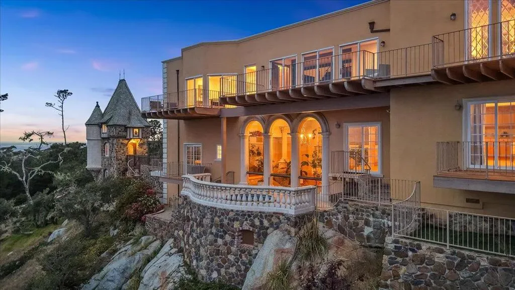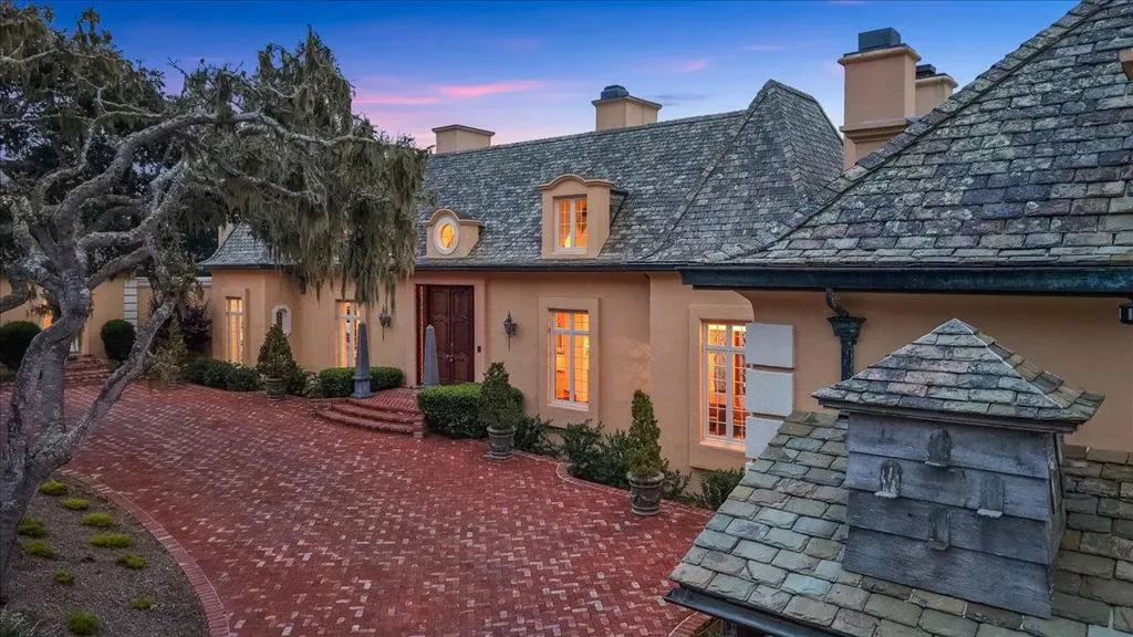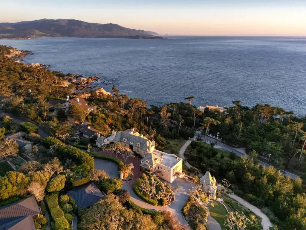 Cantilevered balconies extend over a canopy of cypress trees, revealing unbroken views of Point Lobos. The sea appears as an infinite sheet of white light, the sun’s rays refracting through a fine mist at the water’s edge. A French chateau on a private street with only four homes, this Pebble Beach residence spans nearly three acres, connecting Ballantrae to the lower gate of 17 Mile Drive. A castle-tower guest house feels transported from a storybook, while each room of the main house reflects genuine Old World sensibility. In the kitchen, exposed dark wood ceiling beams and Saltillo terracotta flooring frame ivory cabinetry, premium appliances, and a La Cornue range. In the dining room, diamond-paned windows with beveled glass cast shimmering waves of light across the table. Once dinner guests disperse and the entire house bathes in a warm amber glow, retreat to an intimate living room where bookcases house cherished volumes behind wire-mesh cabinets flanking a flickering fireplace. After nightfall, on your way to a moonlit soak in the outdoor hot tub, pass through a solarium where classical columns surround an ancient rust-hued rock. Breathing in its earthy scent while the ocean roars endlessly below, you’ll smile to yourself at this special symphony of landscape and artistry.