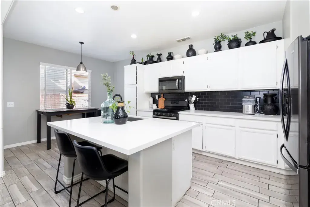 3893 Moravia Ct, Perris, CA 92571 – This inviting 3-bedroom, 2.5-bath two-story home sits on a quiet cul-de-sac on a corner lot in the family-friendly Villages of Avalon community. The open floor plan features a cozy living room with gas fireplace, ceiling fans, and neutral tones for bright, airy living. The updated kitchen shines with white cabinetry, Quartz countertops, black subway tile backsplash, stainless steel appliances, island, and separate dining space. Upstairs, all three bedrooms offer privacy, including a spacious master suite with en-suite bath and dual closets, plus two bedrooms with front-facing balconies. A full bath serves the secondary bedrooms, with a convenient half bath downstairs for guests. Enjoy indoor laundry upstairs, a 2-car attached garage, covered front porch, and a nice backyard for family time.Community perks include a sparkling pool/spa, nearby parks, and 24-hour security patrol.