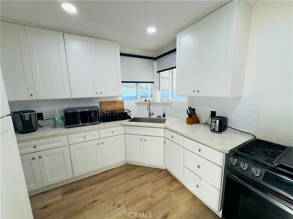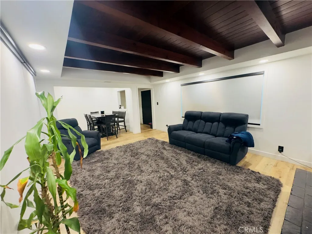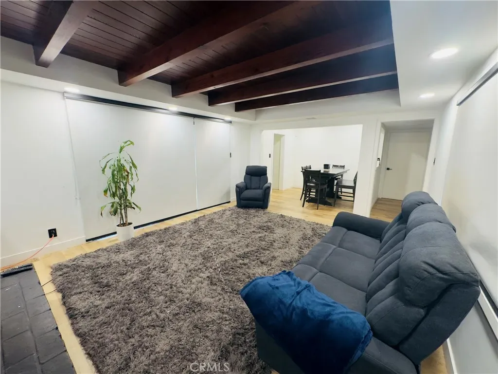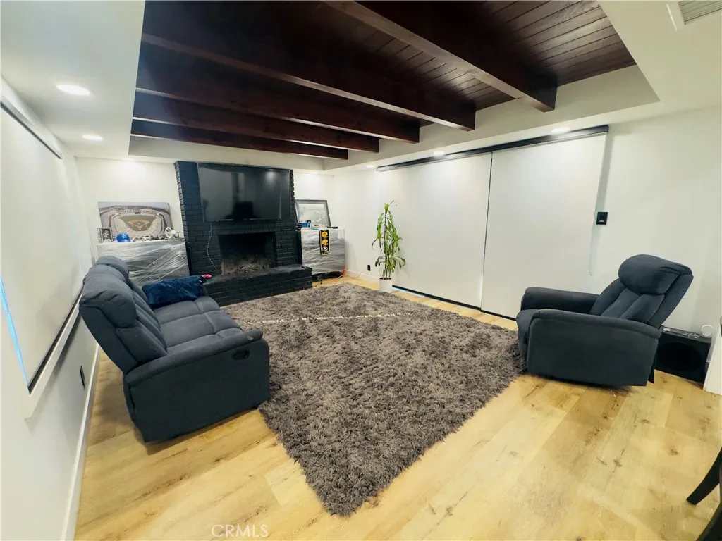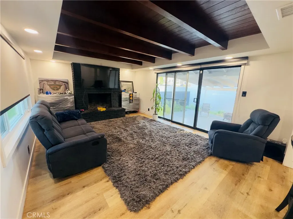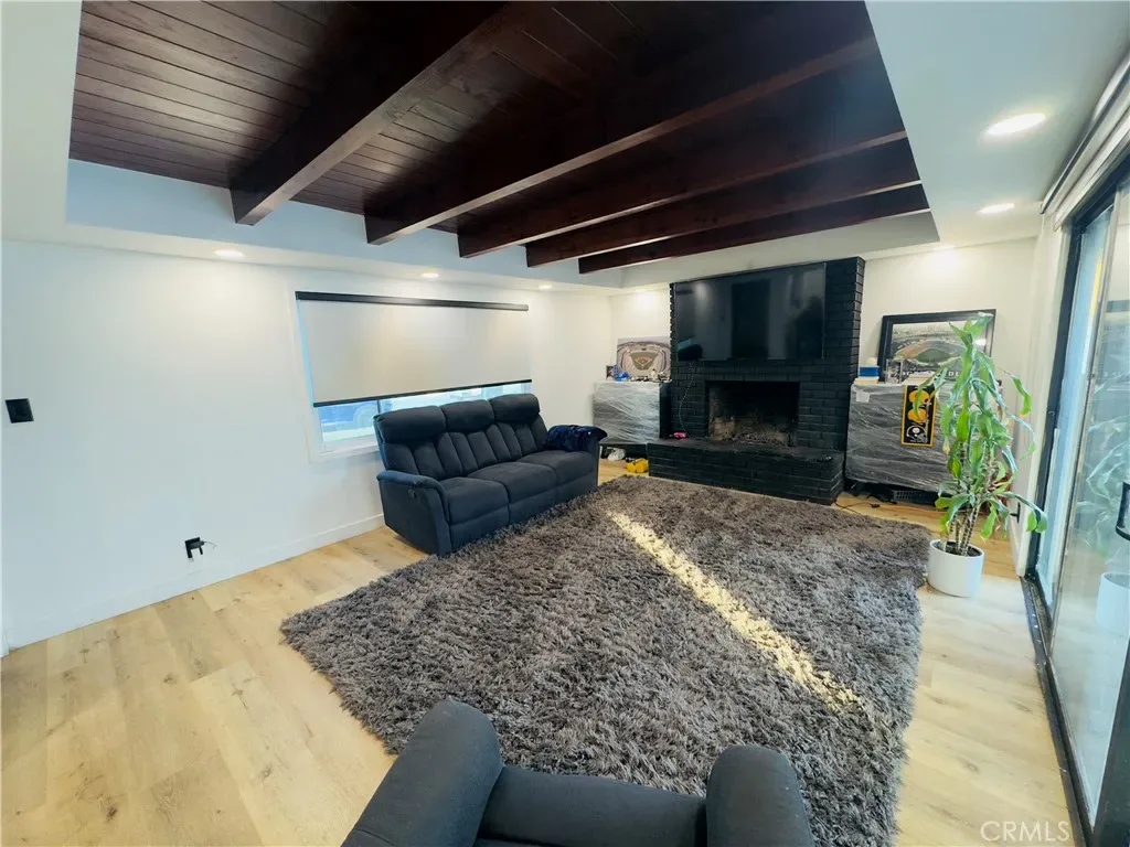 A great opportunity to own a turnkey home in a desirable Pico Rivera neighborhood! This move-in ready property blends modern upgrades with warm, inviting design. Step into a spacious living room featuring stunning exposed wood beam ceilings, a sleek black brick fireplace, and an open layout filled with natural light. The home showcases newer flooring throughout, recessed lighting, and a clean, contemporary feel.
