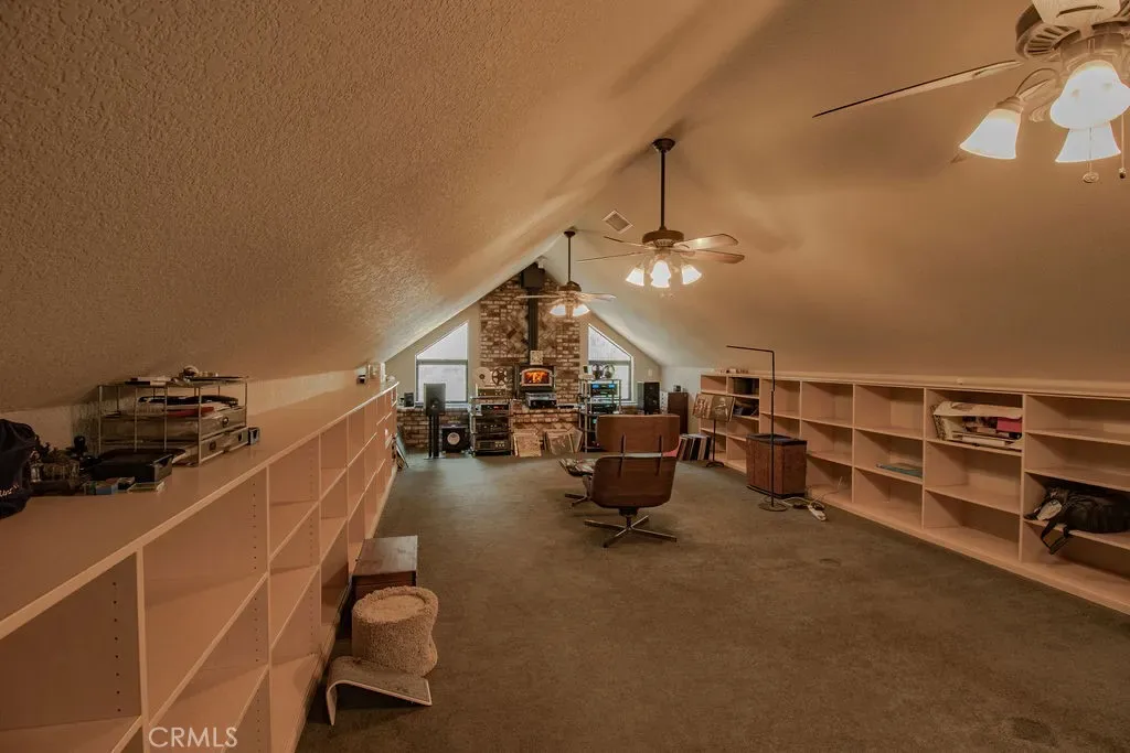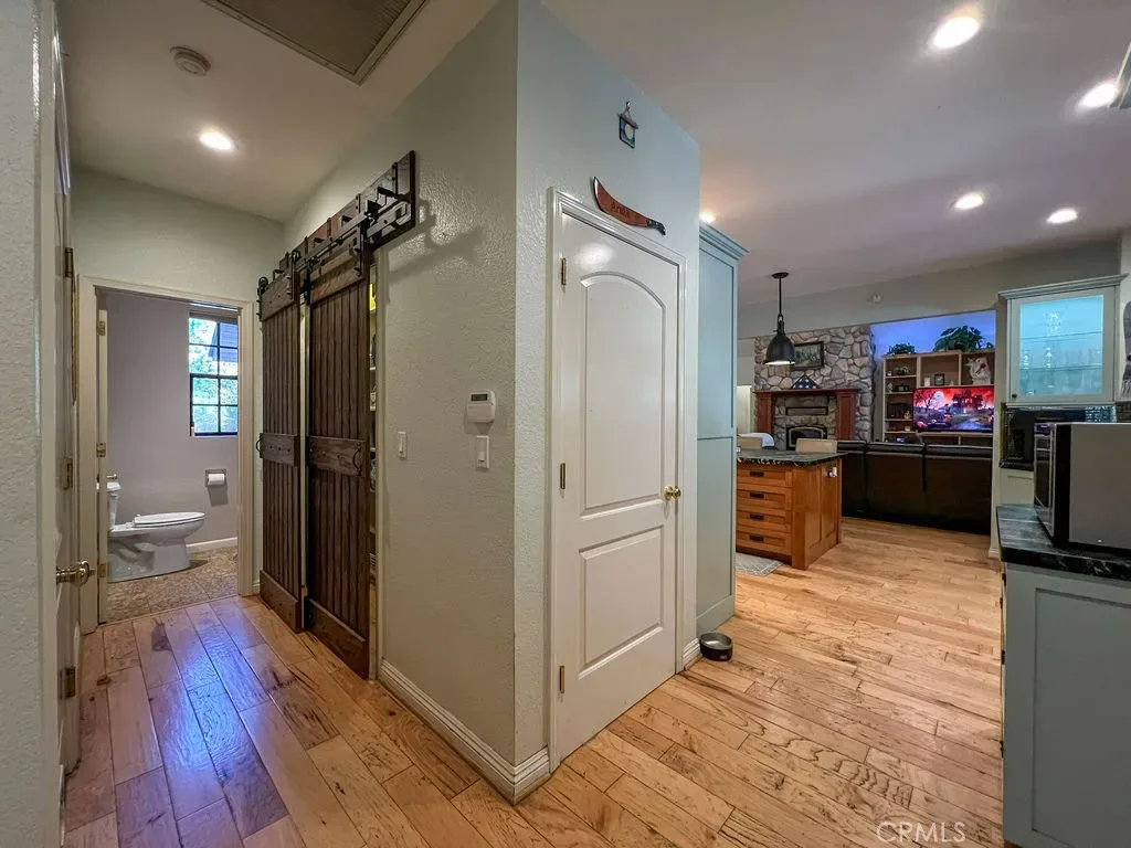 Versatile Game Room/Office: A massive 675 sq. ft. game room with a wood-burning stove, 68×3′ wall shelves, and a 42′ storage closet—ideal for work, play, or hobbies. Hickory wood flooring flows throughout, complemented by recessed lighting for a warm, inviting glow.