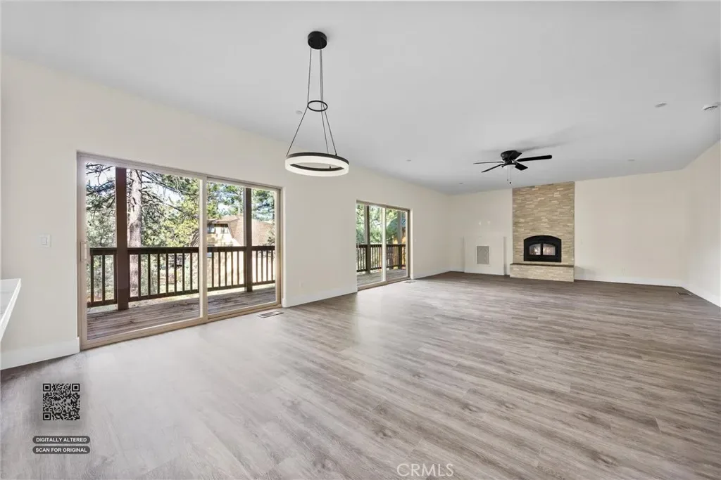 Defined by clean lines and expansive glass, the home unfolds with a quiet confidence. The main living space opens as one continuous volume, anchored by a fireplace and framed by sliding glass that extends the experience outward to a full-length covered deck.