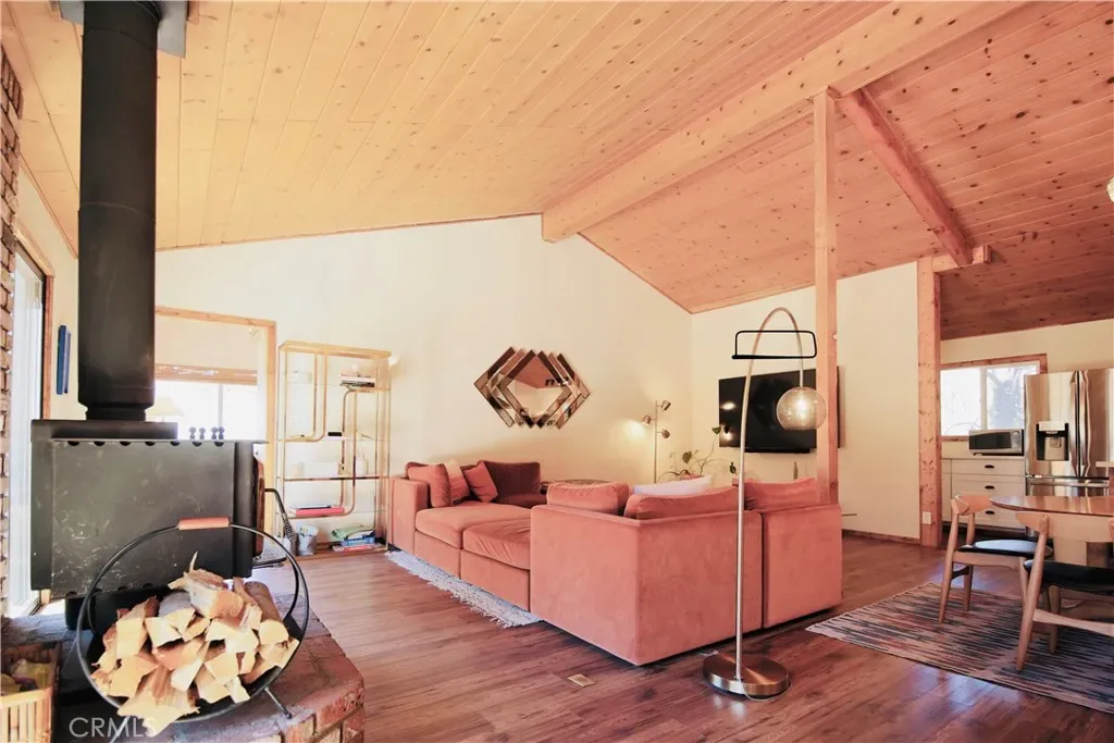 Step inside to an impressive living room with a wood-beam cathedral ceiling, warm laminate wood floors, and a wood-burning stove set on an elevated brick hearth. The open floor plan connects the living, dining, and kitchen areas seamlessly, while a separate family room creates the perfect retreat for kids or cozy evenings.