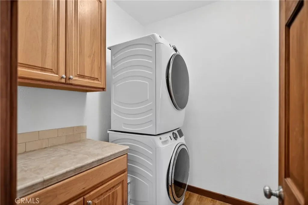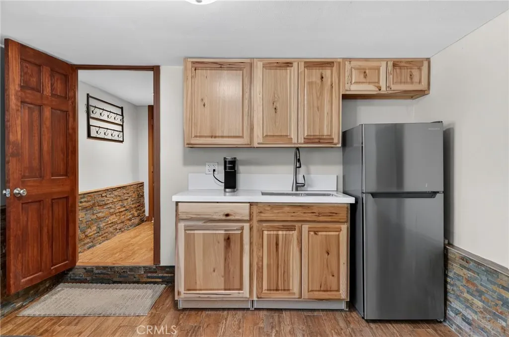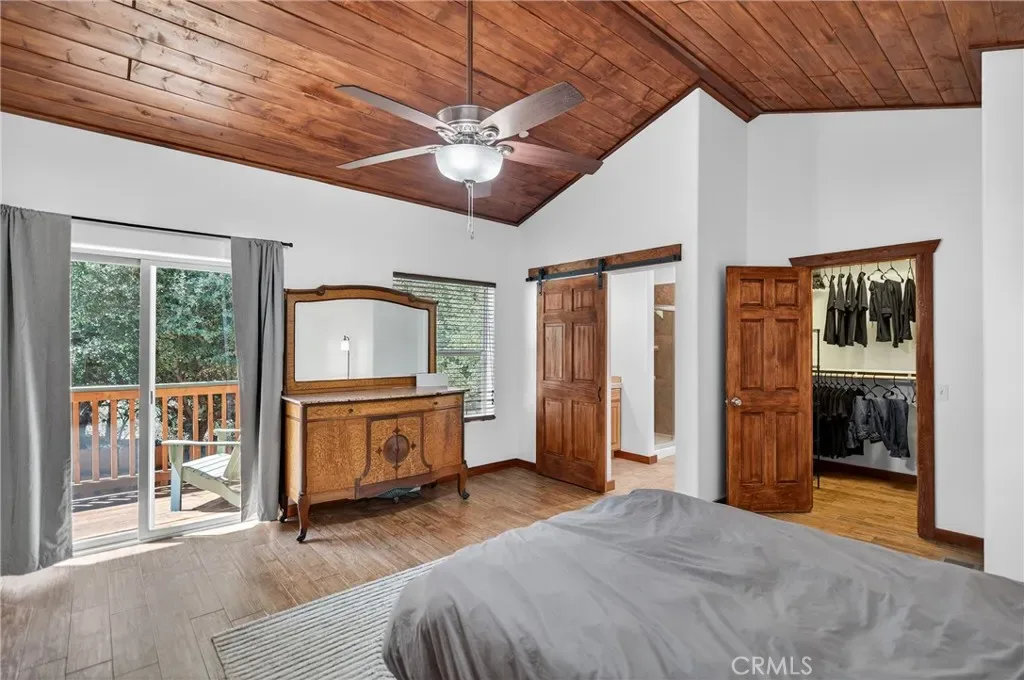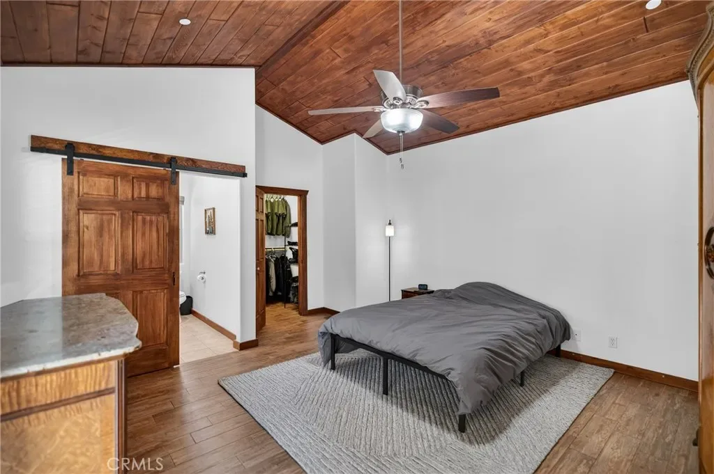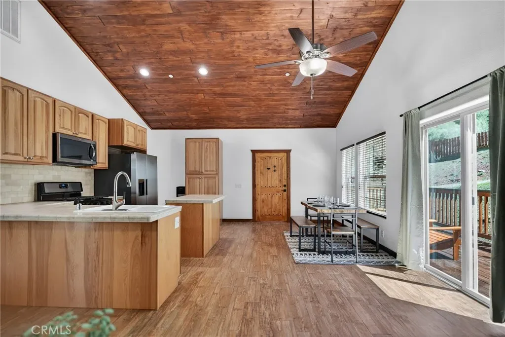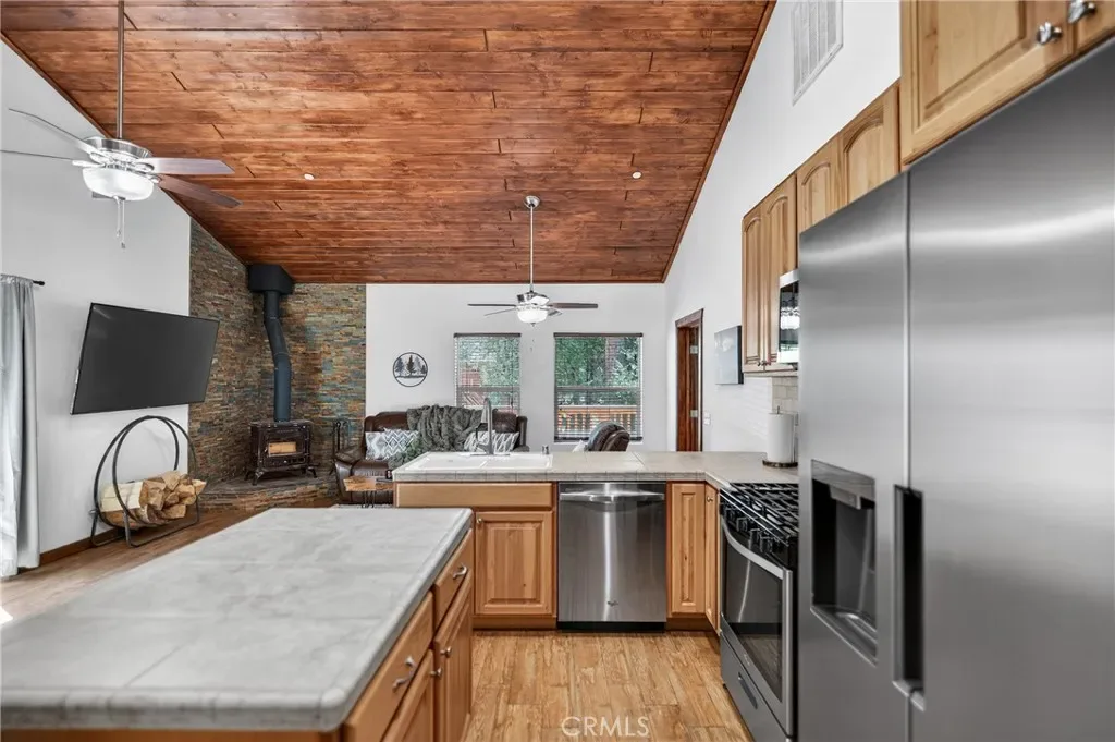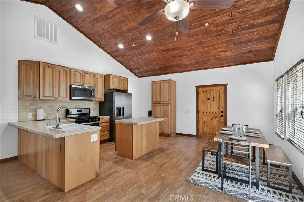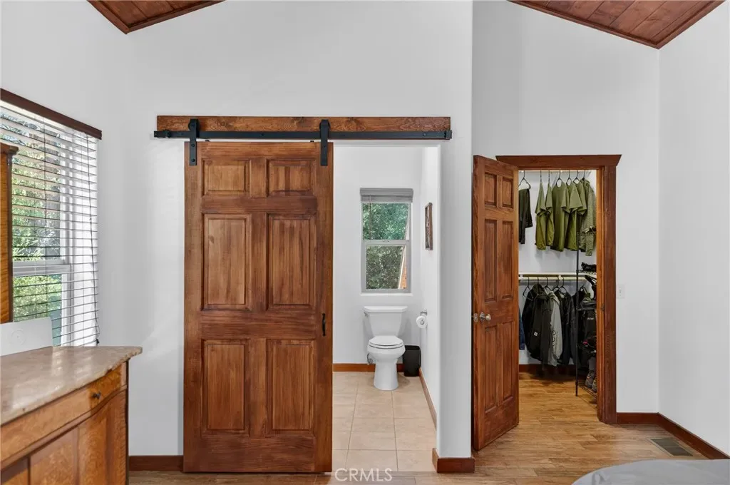 The kitchen offers ceramic tile countertops, custom hickory cabinetry, propane stove, refrigerator, microwave, and dishwasher—perfect for everyday living or entertaining. The oversized primary suite includes a spacious walk-in closet and a stylish barn door leading to the bathroom. Flooring throughout the main level is wood-look ceramic tile, with new carpet in the second bedroom. Step outside onto the wraparound deck and enjoy peaceful views of the north side of Mt. Pinos.