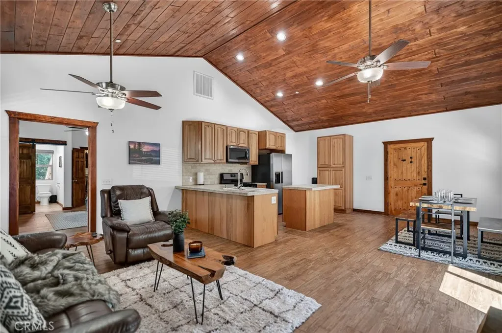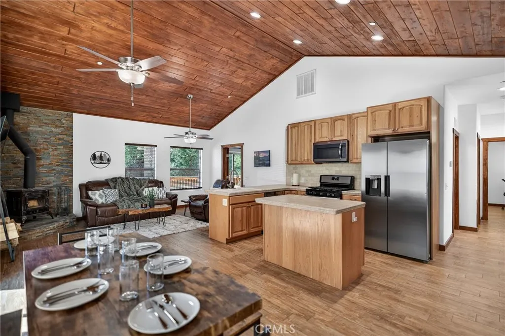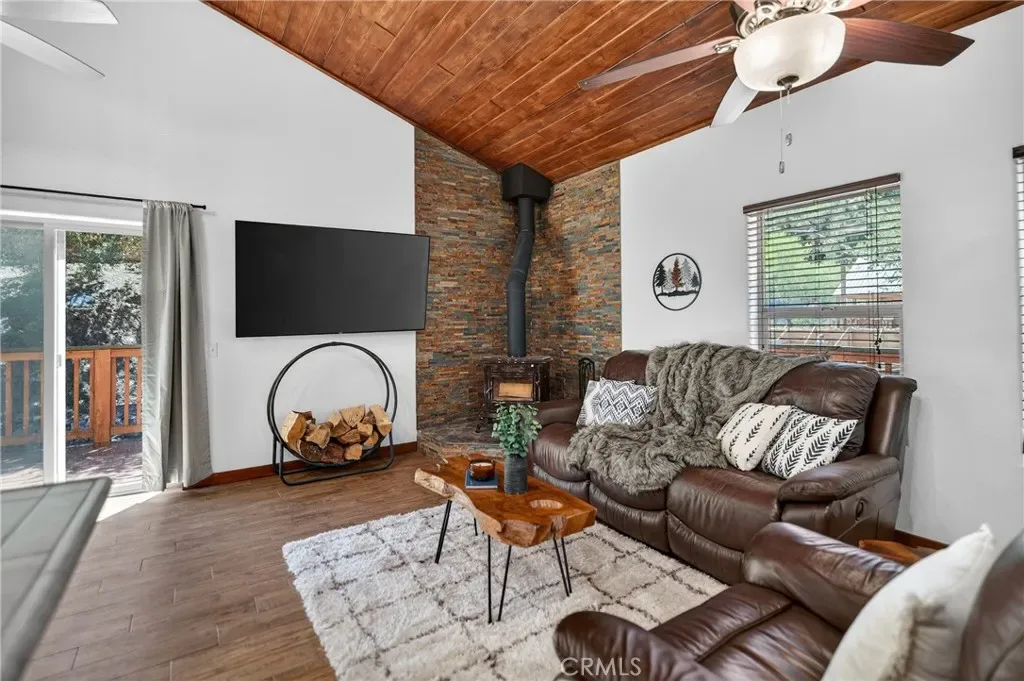 This beautifully maintained home features 1,176 sq ft on the main level plus an additional 311 sq ft of flexible lower-level living space, ideal for guests or a private rental setup. Inside, soaring wood ceilings and an open-concept layout create a warm, inviting atmosphere. The living room is anchored by a wood-burning stove with a dramatic floor-to-ceiling stackstone surround and stone hearth, complemented by a custom knotty alder entry door.