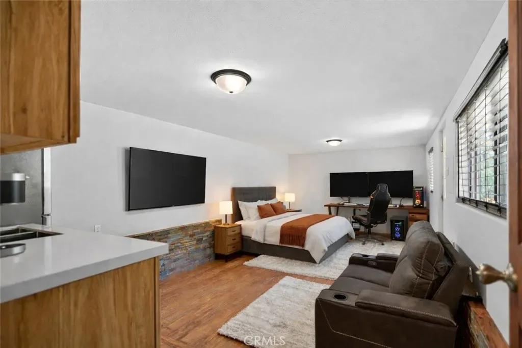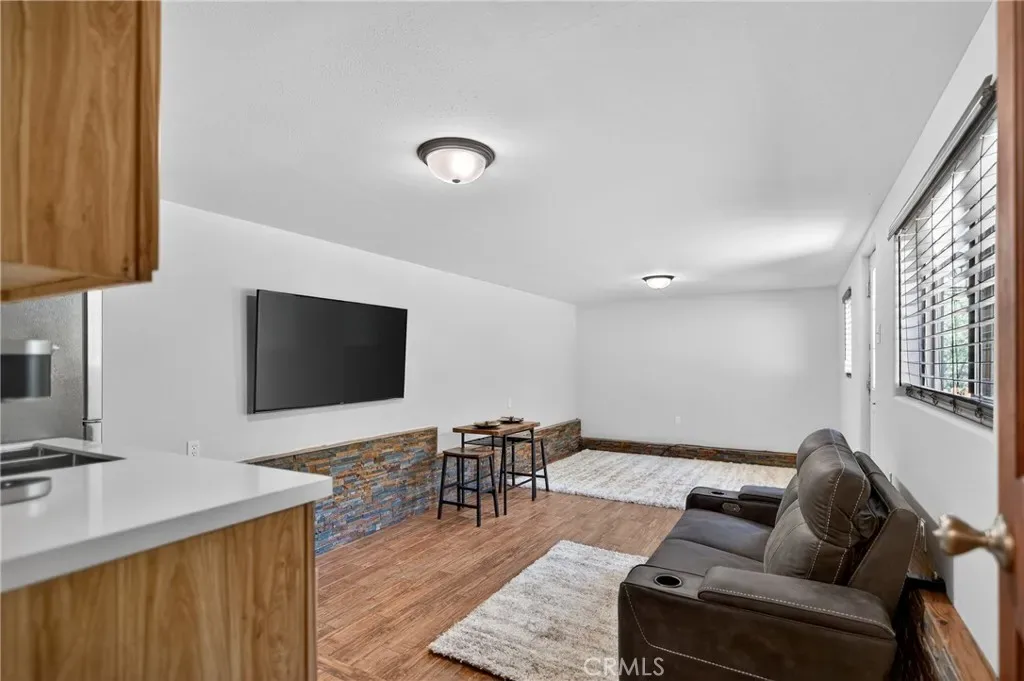 Downstairs, the 10×25 flex space features a kitchenette and a 9×10 bathroom, both finished with durable wood-look tile—ideal for guests, a studio, or rental use. A separate 10×10 utility room includes a tankless water heater and water softener.