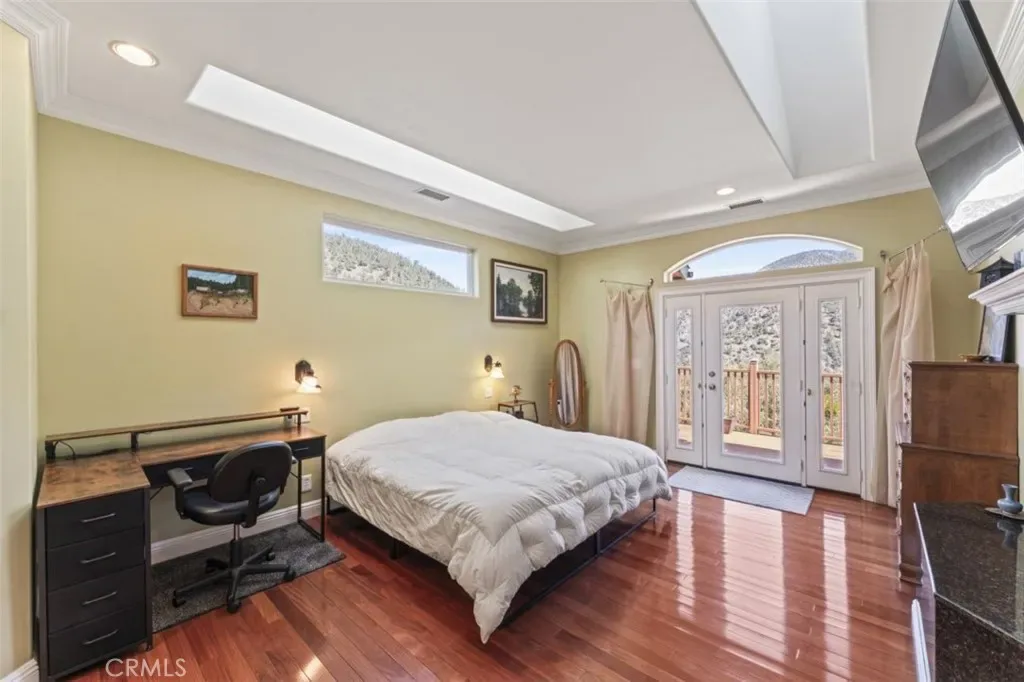 The main level features recessed lighting, gorgeous mahogany floors, vaulted ceilings, and a built-in bookcase, all centered around a wood-burning fireplace and a large picture window overlooking the front yard with a blossoming plum tree. This level includes two bedrooms, including the main bedroom, which serves as a private retreat with a fireplace, walk-in closet, en-suite bath with a spa tub and bidet, and access to its own deck with expansive views of the mountains.