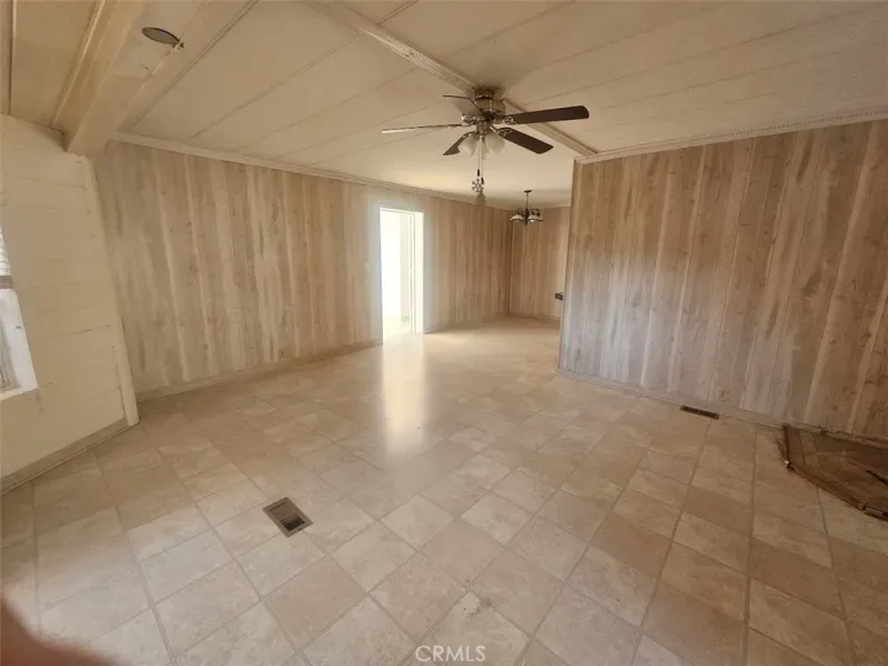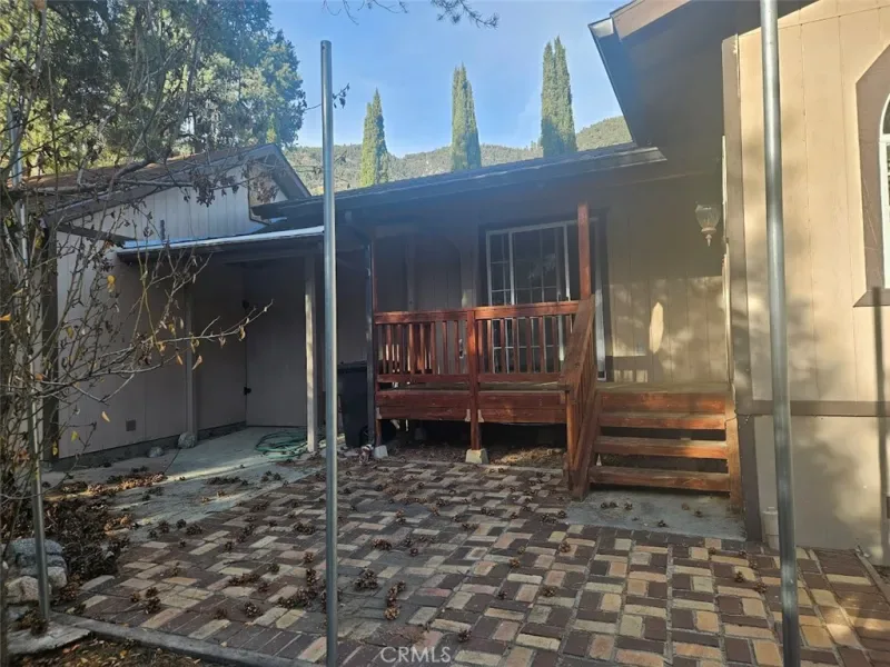 House has open floor plan, vaulted ceilings, numerous windows, two large skylights bringing a lot of light inside. There are three good size bedrooms, including master with sliding doors leading to covered porch and side yard. Another sliding door connects huge living room with large space with its own bathroom and private deck leading to the back yard.