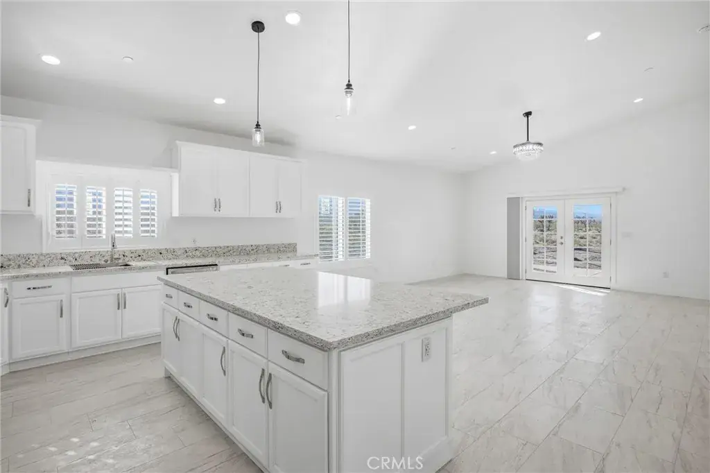 The open-concept layout features a vaulted living room ceiling, white marble-style flooring, and recessed lighting throughout. Smart Wi-Fi–enabled chandelier ceiling fans provide music capability in all bedrooms. The kitchen showcases custom cabinetry, a full-height cabinet pantry, and a large island with quartz countertops featuring a marble-like finish. Home is equipped for either all-electric or propane appliances.