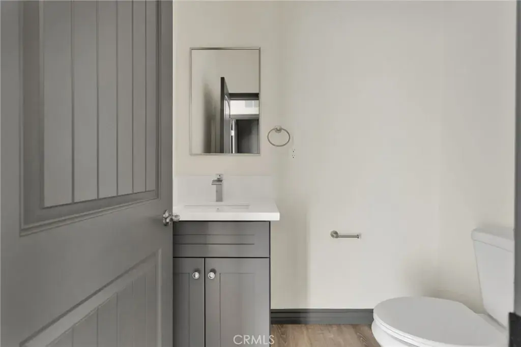 Inside, the open-concept layout showcases a clean, modern palette with contrasting dark trim, luxury vinyl plank flooring, and plush bedroom carpeting. The chef’s kitchen features gray cabinetry, soft-close drawers, custom quartz counters, and coordinated finishes carried through the bathrooms, hallway, and laundry room.