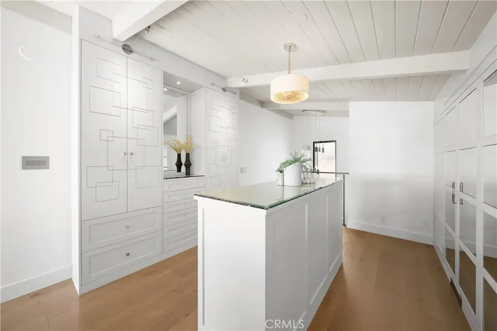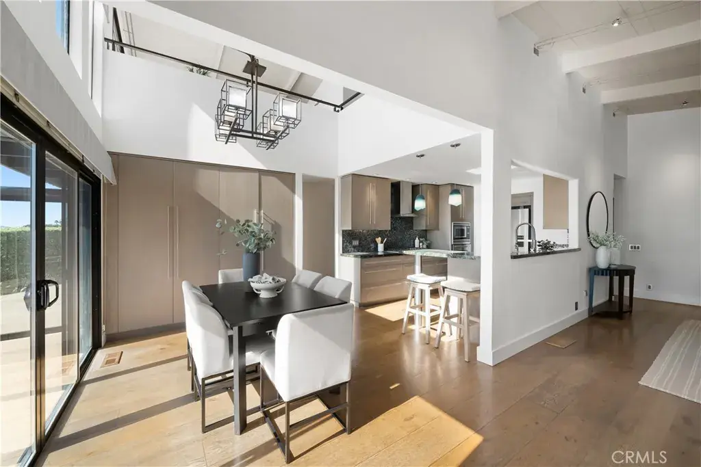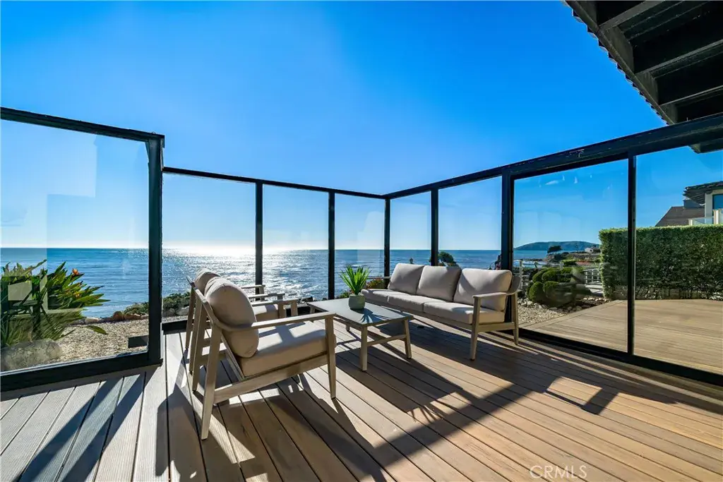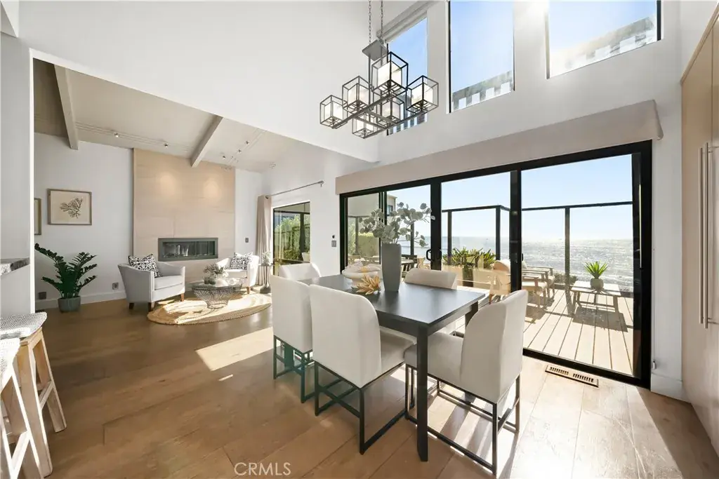 The open-concept main level welcomes you with vaulted beamed ceilings and wide-planked flooring that carries throughout the space. Walls of glass frame endless blue horizons and open to a glass-enclosed deck designed for entertaining, dining al fresco, or simply soaking in breathtaking sunsets over the Pacific. The great room centers around a sleek linear fireplace and flows effortlessly into the dining area and gourmet kitchen, where custom cabinetry, a sea-glass mosaic backsplash, and dramatic natural stone countertops reflect the ocean’s hues. Stainless steel appliances, modern lighting, and a stylish breakfast bar complete this elevated culinary space.