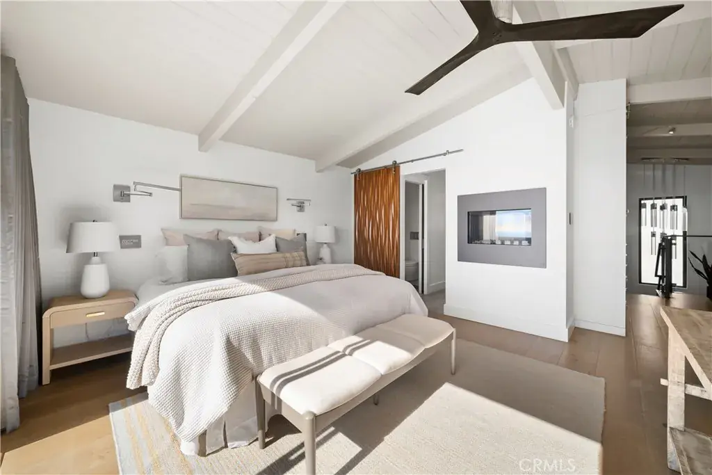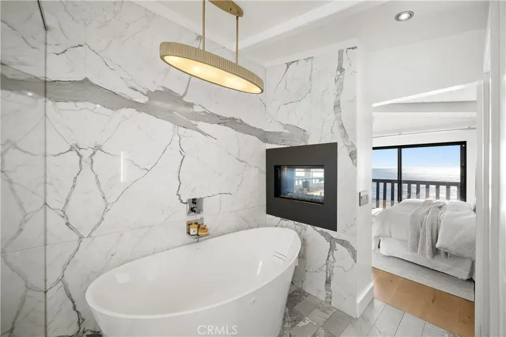 Upstairs, the primary suite offers a serene private escape with vaulted tongue-and-groove ceilings, a contemporary see-thru fireplace, and sliding glass doors leading to a private balcony overlooking the coastline. The spa-inspired ensuite bath features radiant floor heating, marble and glass finishes, dual vanities, and a large walk-in shower that evokes a luxurious retreat. A custom dressing area with built-ins and mirrored cabinetry provides abundant storage and elegance.