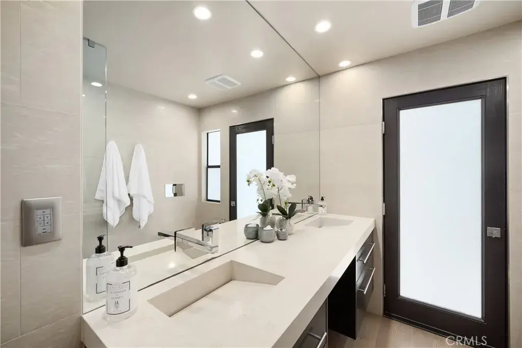 Two additional bedrooms on the lower level open directly to the backyard, each featuring sliding glass doors that invite in sea breezes and uninterrupted ocean views. The guest bath is beautifully appointed with sleek tilework, dual vanities, and a walk-in shower with a rainfall fixture.