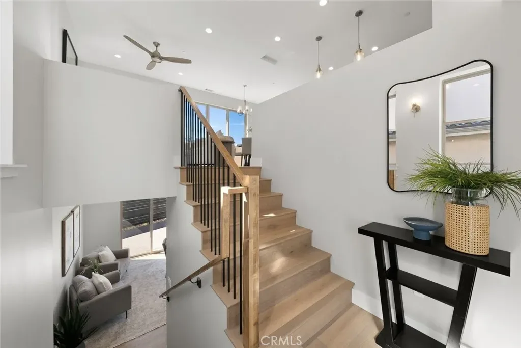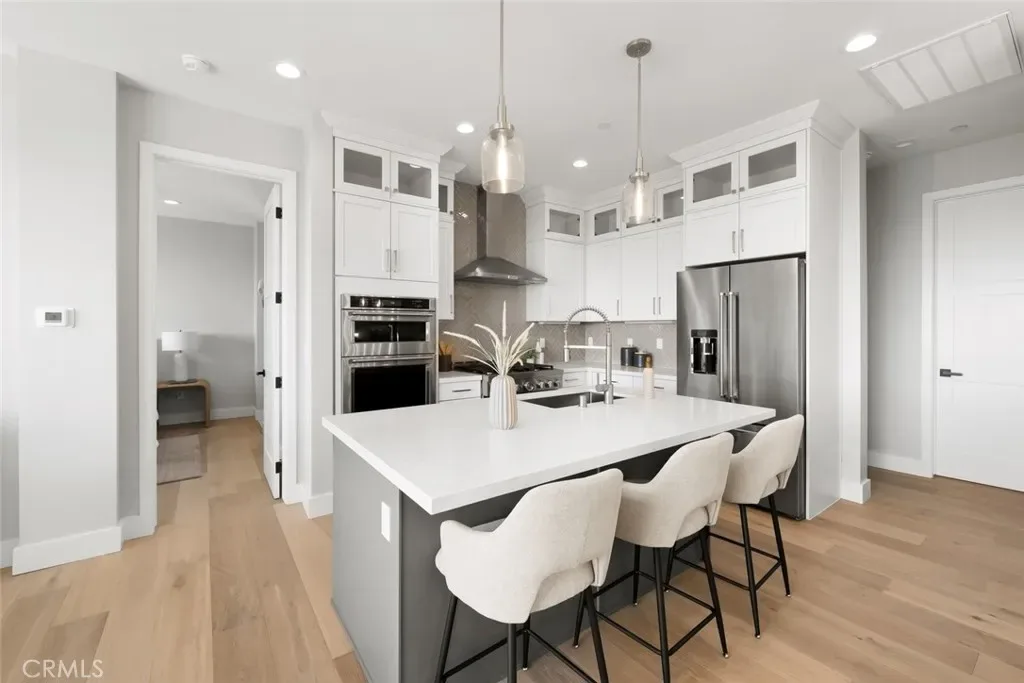 Upstairs, open-concept living elevates everyday life. The main living area is anchored by a gas fireplace and framed by sliding glass doors and expansive windows that flood the space with natural light. The ocean-view balcony just beyond offers a front-row seat to breathtaking sunsets and ocean panoramas. The dining area flows seamlessly into a chef-inspired kitchen showcasing an oversized island with seating and prep sink, stainless steel appliances, decorative tile backsplash, and floor-to-ceiling shaker-style cabinetry. Designer-selected finishes, recessed lighting, and statement fixtures add sophistication throughout.
