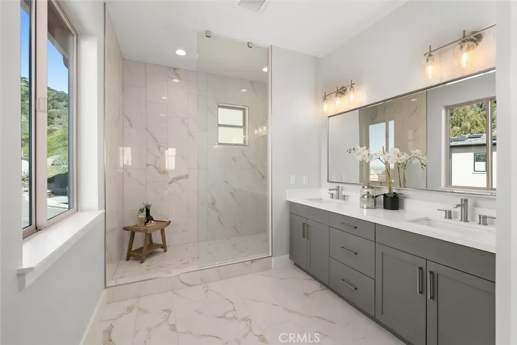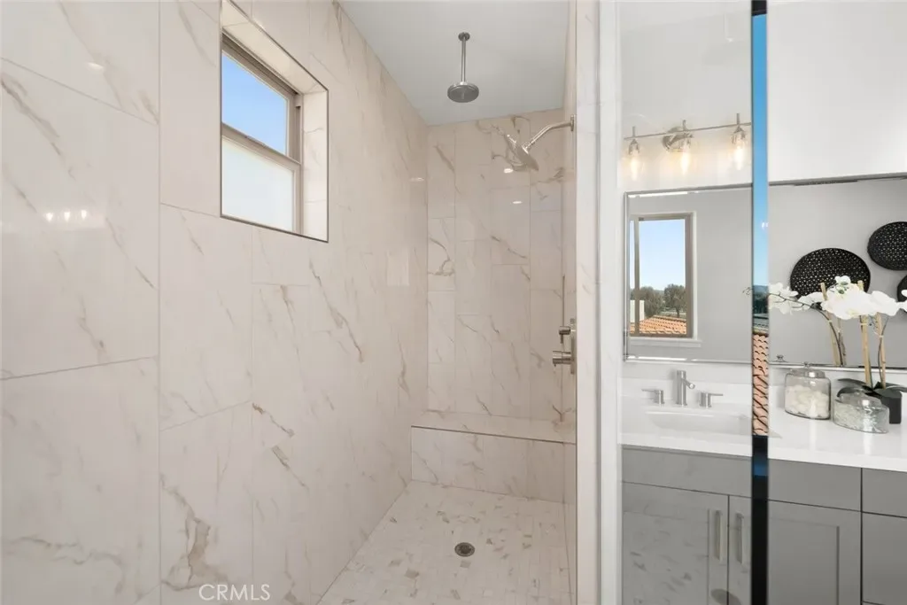 The entry level is thoughtfully designed for comfort and privacy, featuring a spacious family room that opens to the backyard. Two generous bedrooms share a beautifully tiled Jack-and-Jill bathroom with dual-sink vanity, offering both style and function.