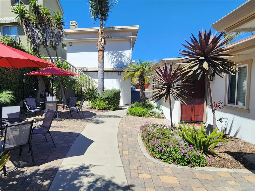 Amenities include large communal patio w/ BBQ, tables, chairs, & umbrellas, surrounded by mature palm trees, plus beach shower. Add’l features include laundry room, storage area, & owner’s room with potential for ADU conversion (buyer to verify). On-site parking includes (3) 1-car garages & (5) uncovered spaces.
