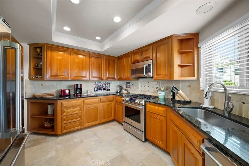 A thoughtfully designed kitchen features granite countertops, creative tile backsplash, recessed lighting, and stainless steel appliances, including a range, microwave/hood, refrigerator, and dishwasher—all framed by cherry cabinetry and sleek finishes.
