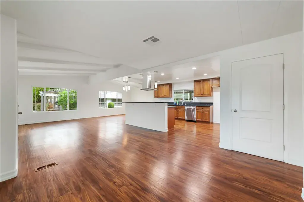 Beautifully renovated 2-bedroom, 2-bathroom home with office in Lake Park Placentia. Premium wood flooring, granite countertops throughout, gas cooktop island, dual vanity primary bath, beamed ceilings, modern lighting. 2020 renovation includes new roof, energy-efficient windows, electrical upgrades, extended carport. Corner lot, single-level living.