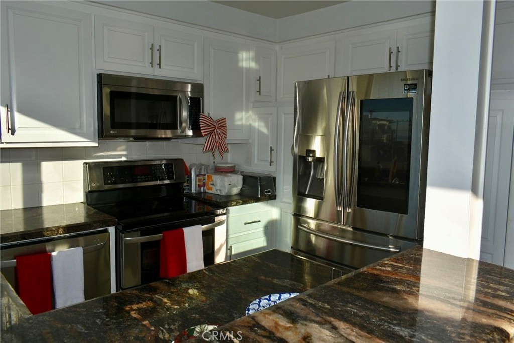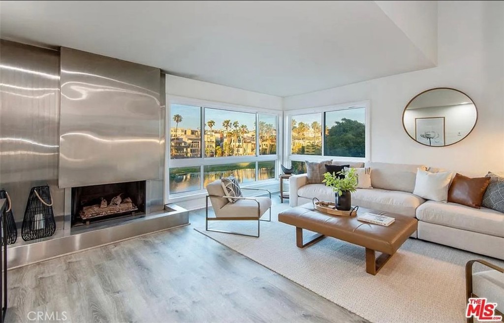The split-level layout features teak wood floors, a custom fireplace, recessed lighting, and a chef’s kitchen complete with granite countertops, custom cabinetry, and stainless steel appliances. Additional highlights include two side-by-side parking spaces, ample private storage, and a dedicated bike room.