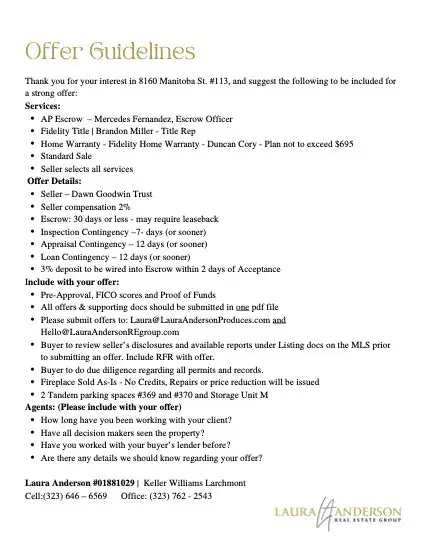 Courtesy of Keller Williams Larchmont. Disclaimer: All data relating to real estate for sale on this page comes from the Broker Reciprocity (BR) of the California Regional Multiple Listing Service. Detailed information about real estate listings held by brokerage firms other than James Outland include the name of the listing broker. Neither the listing company nor James Outland shall be responsible for any typographical errors, misinformation, misprints and shall be held totally harmless. The Broker providing this data believes it to be correct, but advises interested parties to confirm any item before relying on it in a purchase decision. Copyright 2026. California Regional Multiple Listing Service. All rights reserved. 8160 Manitoba ST #113