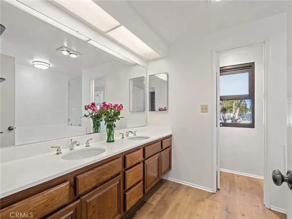 The large primary suite features a private balcony, an expansive cedar-lined walk-in closet with a beautifully remodeled walk-in shower, luxurious soaking tub, and expansive vanity with dual sinks.