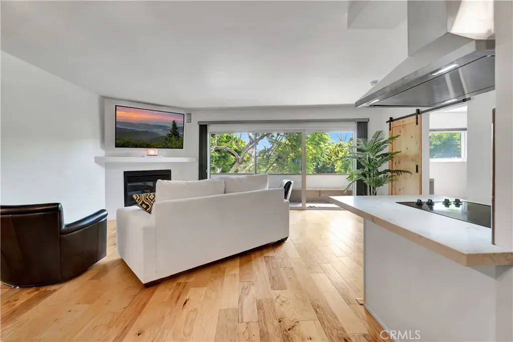 Step inside to wood flooring throughout, solid wood interior doors, and custom solid barn doors that add a designer’s flair while enhancing privacy. The gas fireplace creates a warm and inviting living space, framed by double dual-pane windows that fill the home with natural light while keeping it quiet and energy-efficient.