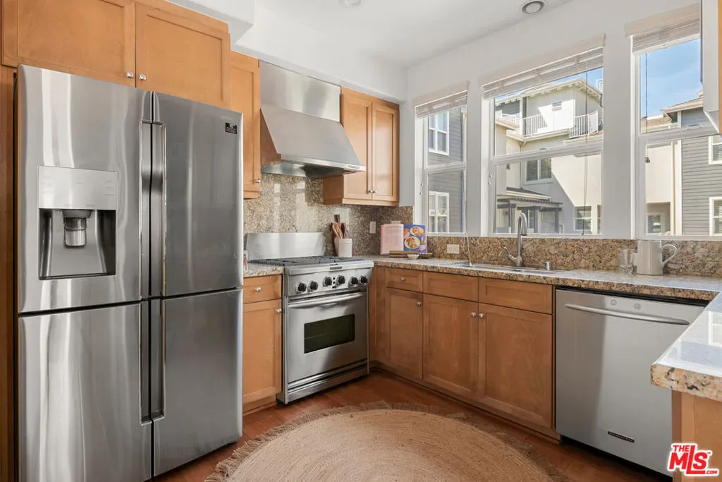 Light & bright south-facing corner townhome with private entry and private 2-car garage in desirable Tapestry II. First-floor living room features high ceilings, slate floors, fireplace, and abundant natural light. Open-concept kitchen, family, and dining area with hardwood floors, granite countertops, and stainless steel appliances, opening to a private balcony. Upstairs offers vaulted-ceiling primary suite and second bedroom filled with natural light. Primary bath with dual sinks and walk-in shower. Close to shops and restaurants. All Playa Vista amenities included Cable & Internet, Resort & Centerpointe Clubs.