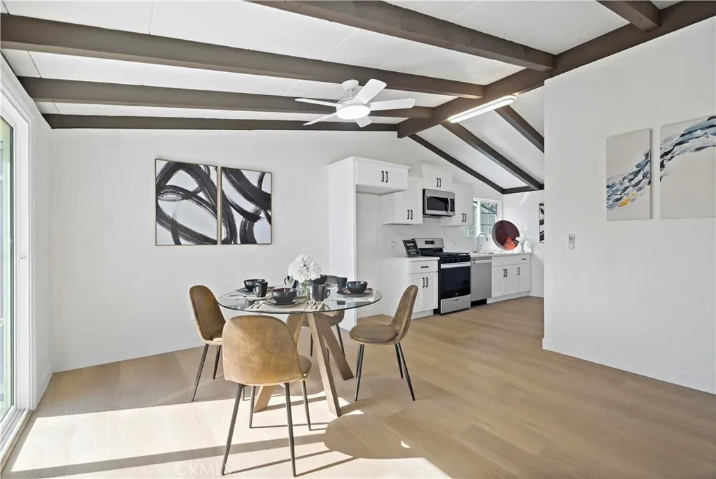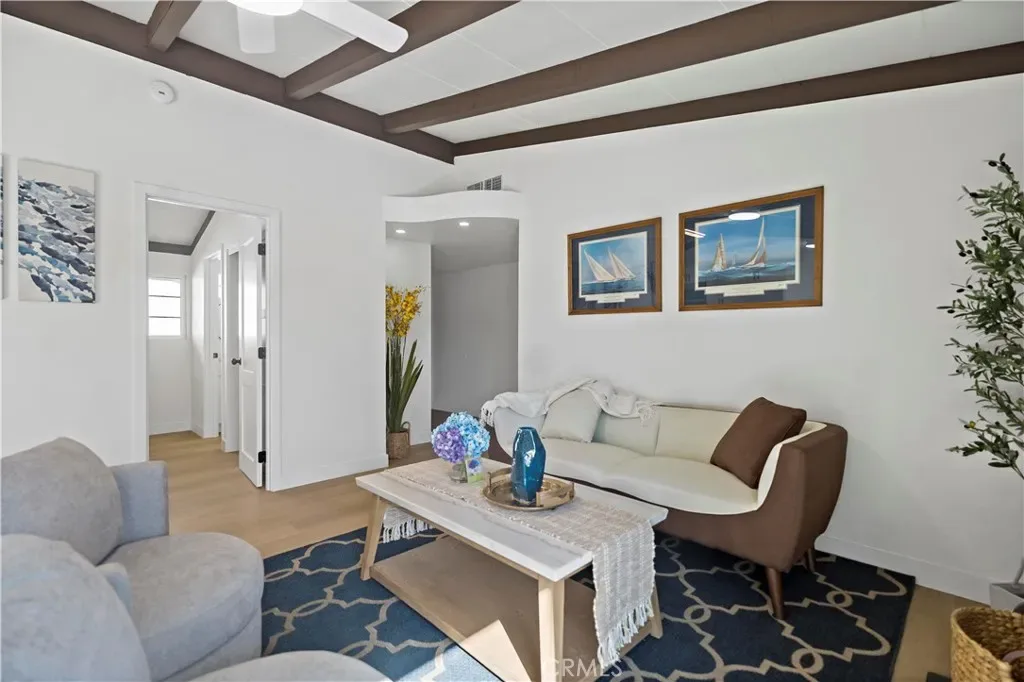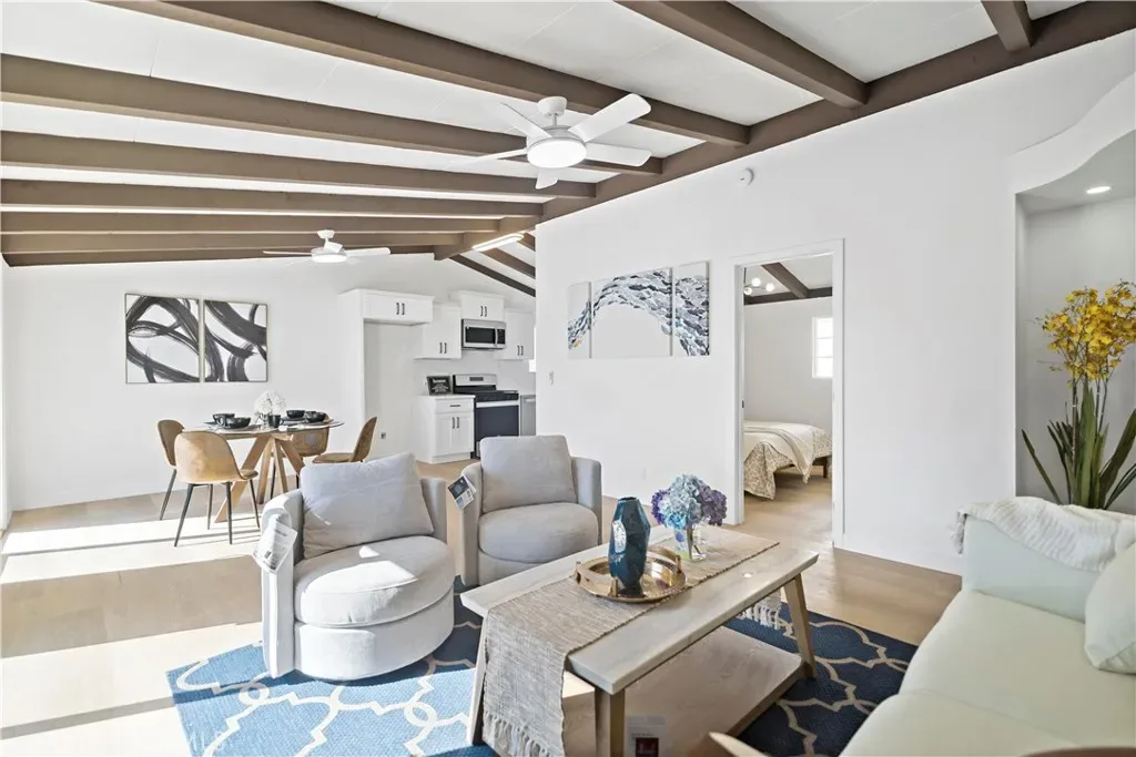 The home features a bright and inviting living area and a fully remodeled kitchen equipped with stainless steel appliances, perfect for modern living and entertaining.