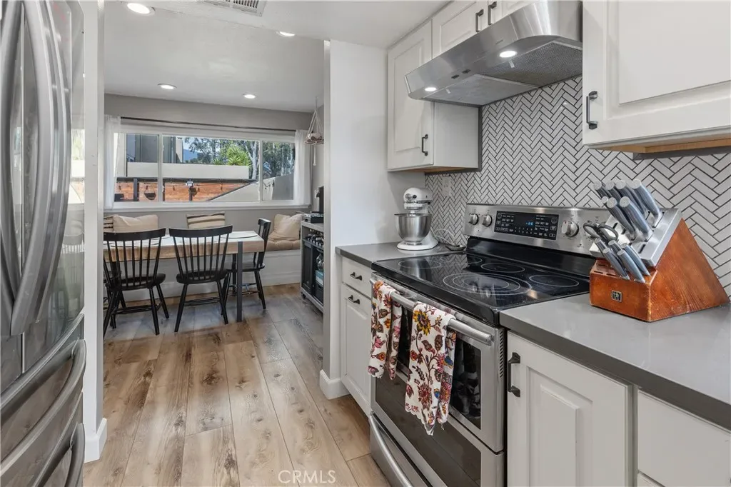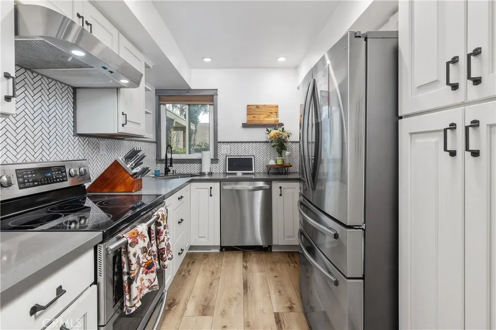 Welcome to this beautifully updated residence in the highly sought-after North Towne Park community, where modern design and everyday comfort come together in one inviting space. This 2-bedroom, 1.5-bath condo offers 1,146 square feet of thoughtfully curated living with stylish finishes and a light, airy ambiance throughout. Step inside to a bright and inviting living room featuring soaring vaulted ceilings, a cozy fireplace, and updated vinyl flooring that flows seamlessly through the main living areas. Sliding glass doors from the living room lead to a private patio accented with string lights, creating an inviting outdoor space perfect for relaxing or entertaining. At the heart of the home, the upgraded kitchen showcases quartz countertops, stainless steel appliances, white shaker cabinetry, and a striking white and black herringbone backsplash that adds the perfect designer touch. Upstairs, both bedrooms are generously sized and filled with natural light, each featuring vaulted ceilings that enhance the home’s open feel. The primary bedroom offers a comfortable retreat, complete with an ensuite bathroom, a spacious closet with built-in organizers, and a private balcony—perfect for enjoying morning coffee or unwinding in the evening. Downstairs, a convenient powder room includes an updated vanity along with an in-unit washer and dryer. Additional highlights include a one-car attached garage plus an additional covered carport space for added convenience. Residents of North Towne Park enjoy access to community amenities including a pool, spa, clubhouse, and lush greenbelts. Ideally located within the award-winning Claremont School District and just minutes from the Claremont Colleges, the vibrant shops and dining of Claremont Village, and convenient access to the 210 freeway. This home offers the perfect blend of lifestyle and location.