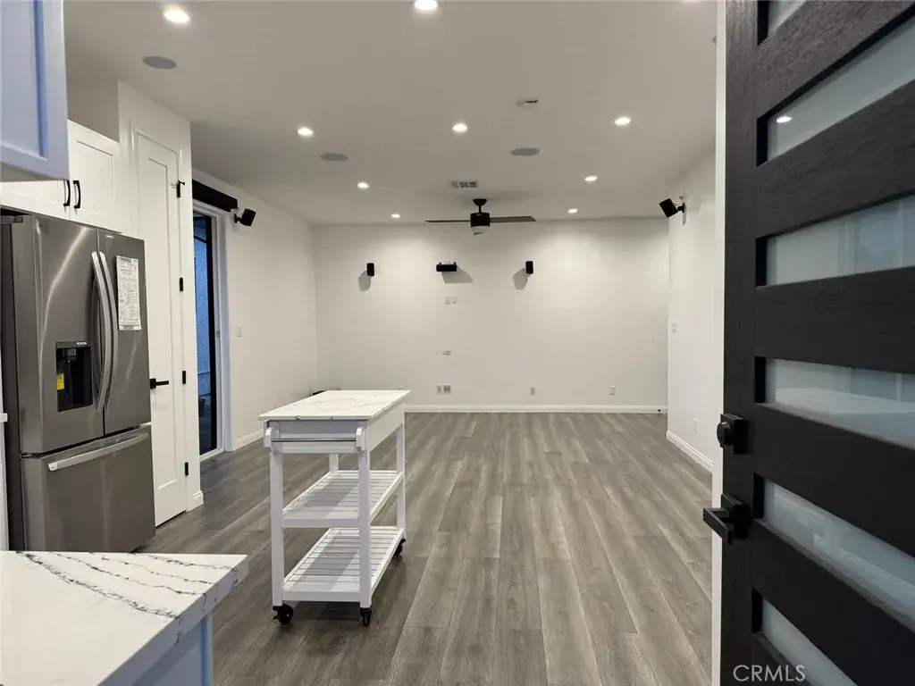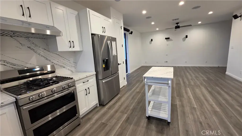 Inside, 9 ft ceilings and an open-concept layout create an airy feel. The kitchen blends clean design with everyday function, featuring a gas range, refrigerator with water connection, dishwasher, custom soft-close cabinetry, Corian countertops with seamless matching backsplash, built-in pantry shelving, under-stair storage, and a custom rolling prep island.