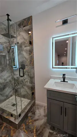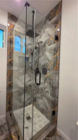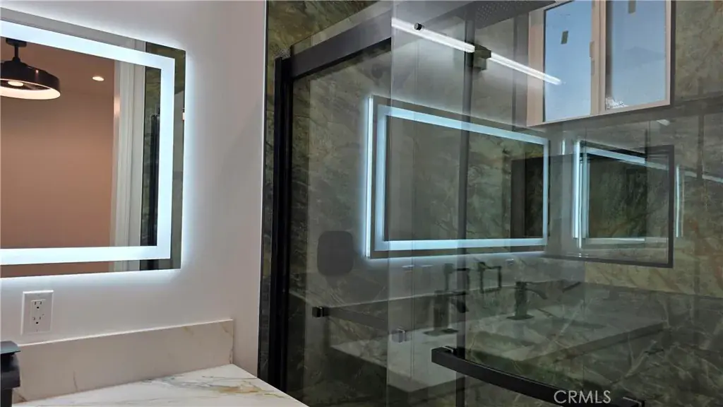 All three bathrooms are finished with floor-to-ceiling large format tile, Corian vanities, fog-resistant mirrors with adjustable lighting, and rain plus handheld shower systems, creating a refined, spa-inspired atmosphere.