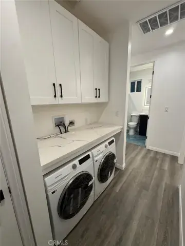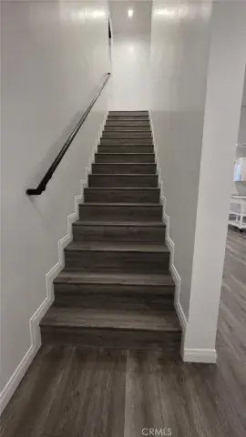 Upstairs, the primary suite includes a walk-in closet and dual-sink vanity, while two additional bedrooms provide flexible space for children, guests, or a home office. In-unit laundry is conveniently located just outside the bedrooms.